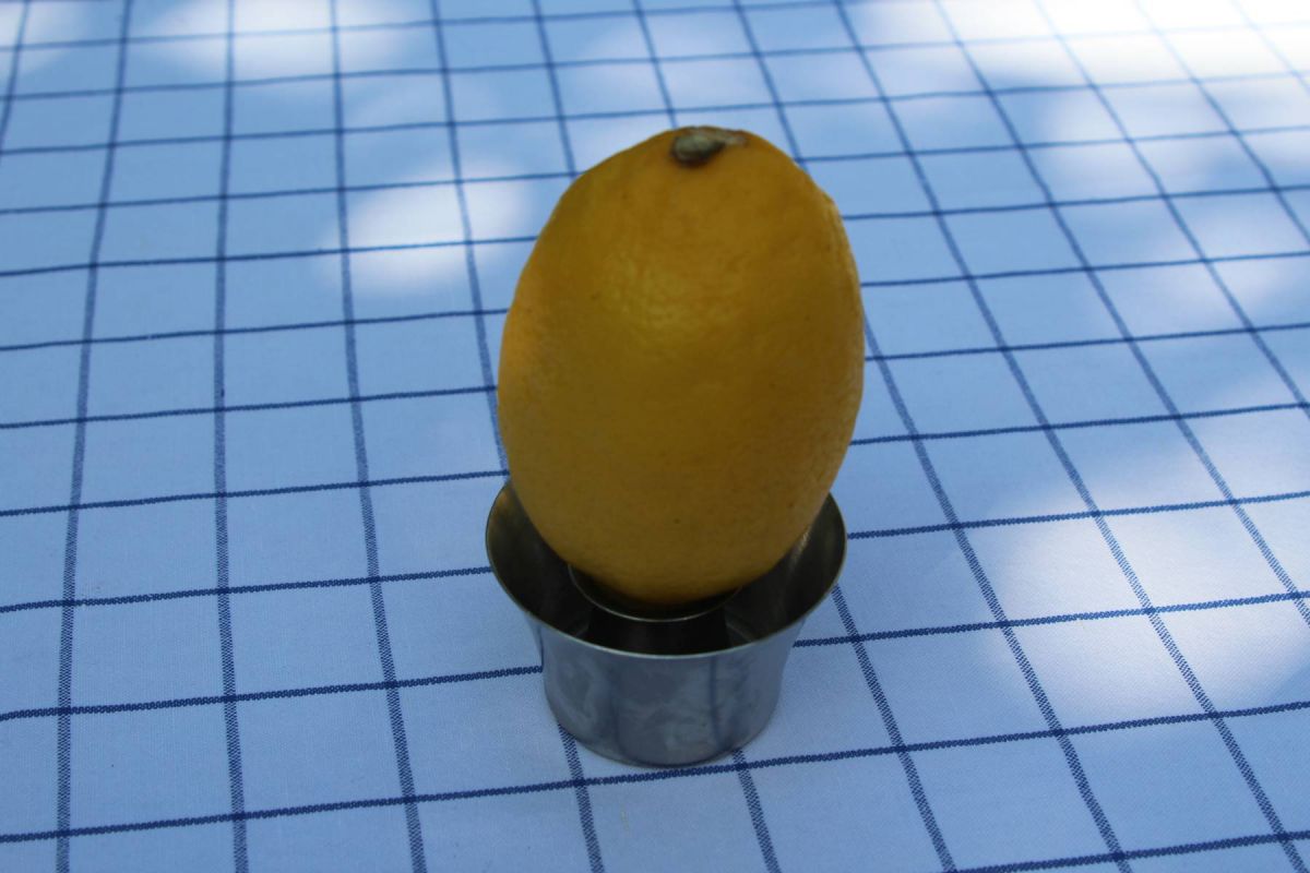 Die Zitrone von allen Seiten durchwalken und dann über dem Schüsselchen anstechen. Man kann immer soviel herauspressen, wie benötigt wird - ansonsten senkrecht im Kühlchrank verwahren und am Ende noch einmal auf der Tischplatte ordentlich drücken (Tülle nach oben halten!), um die Reste zu entlocken.