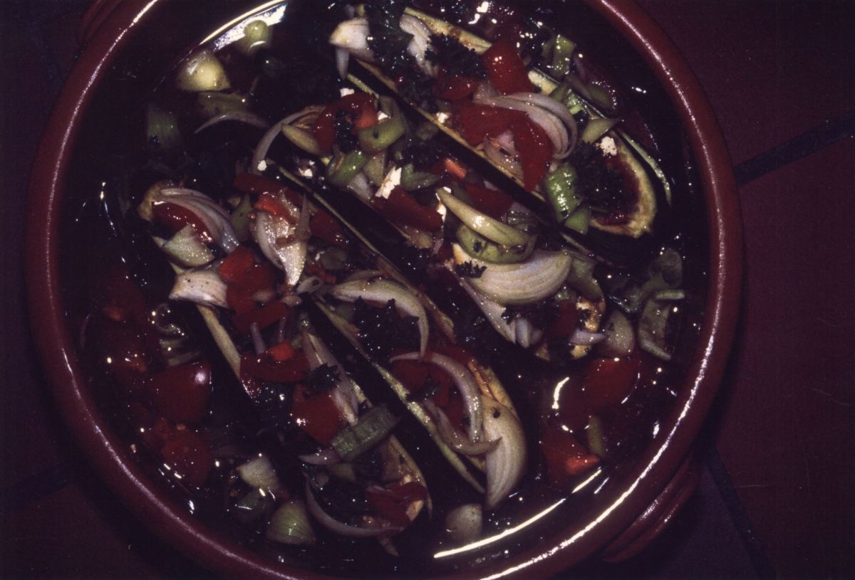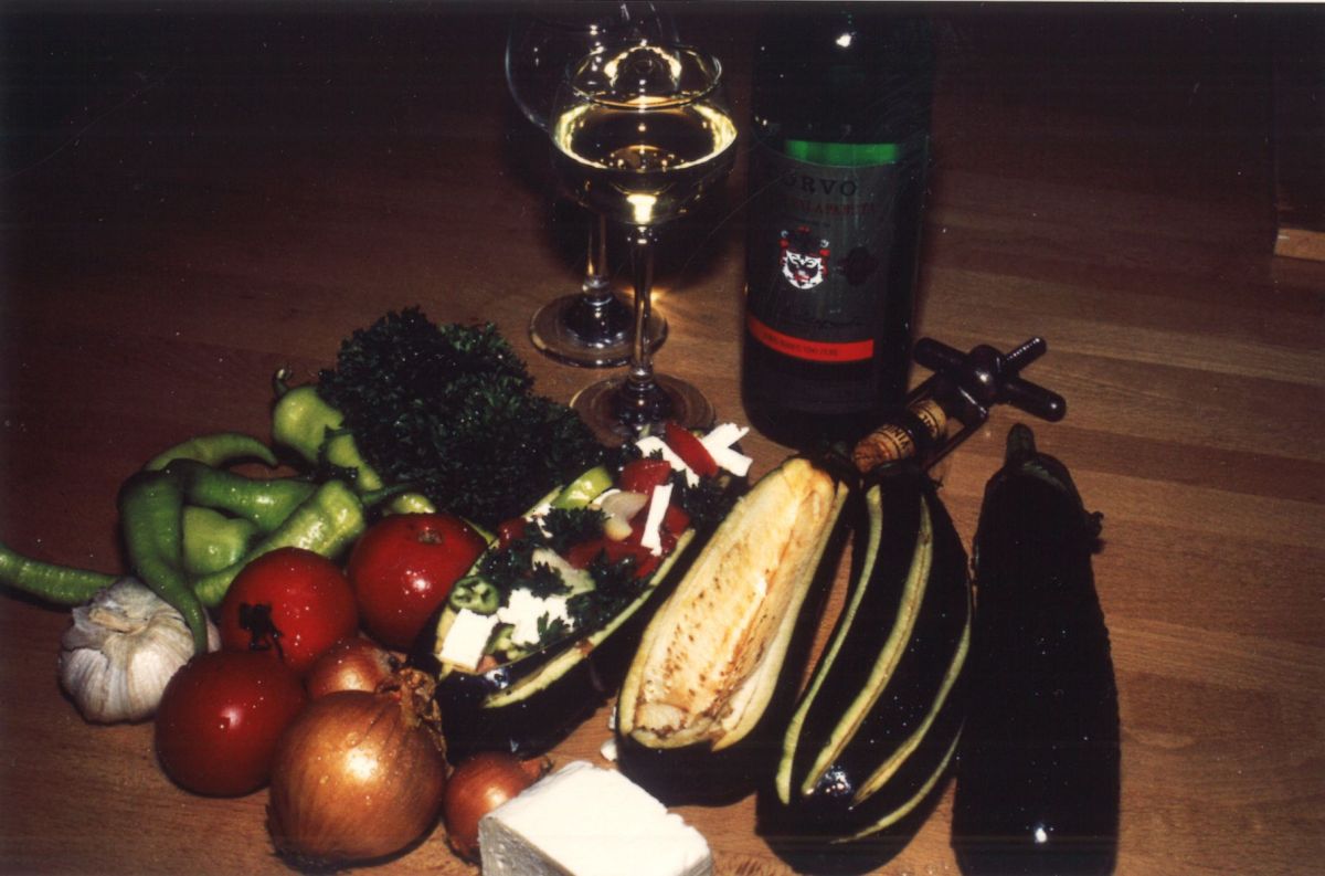 Einkaufsliste: 4 Auberginen, 3 Zwiebeln, 4 Tomaten, 1 Stück Schafskäse, 4 lange milde frische Peperoni oder eine Paprika, 1 Bund glatte Petersilie oder 2 Bund krause Petersilie, 2 Knoblauchzehen, 1/8 l Olivenöl, Pfeffer, Salz, Brühe