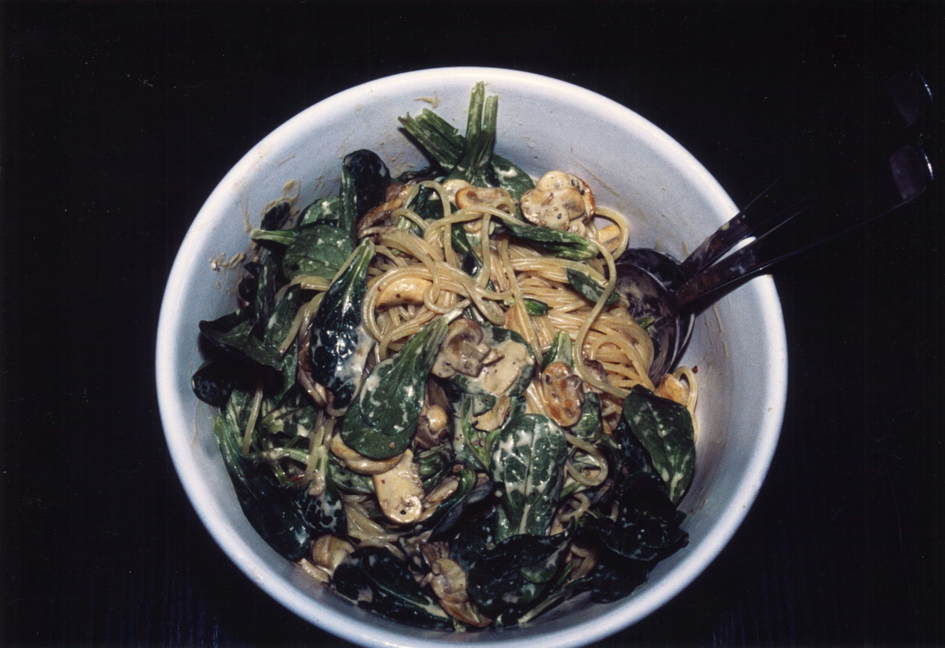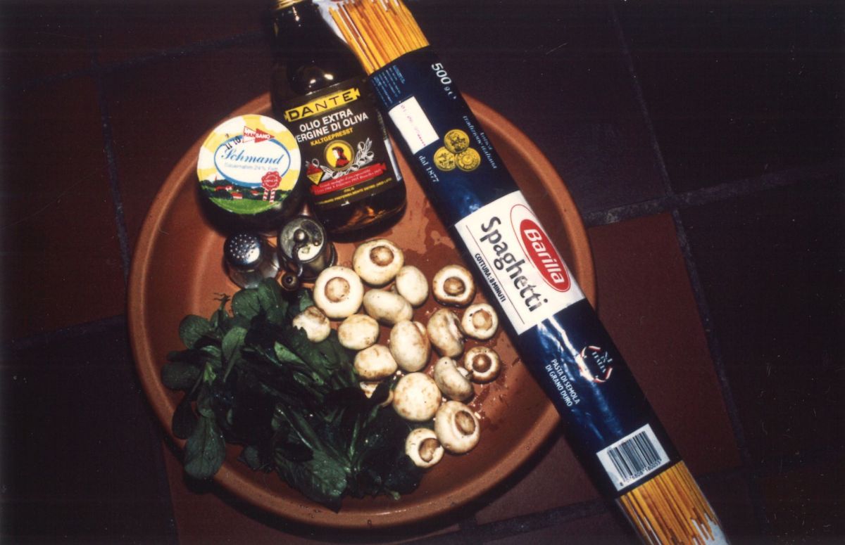 Einkaufsliste pro Person: 125g Spaghetti, 75g Champignons, (ggf 1 kleine Zwiebel), 75g Feldsalat, 1 TL Zitronensaft, 1 EL Wasser, 3 TL Créme fraîche, Pfeffer, Salz, Öl, (ggf etwas Knoblauch)