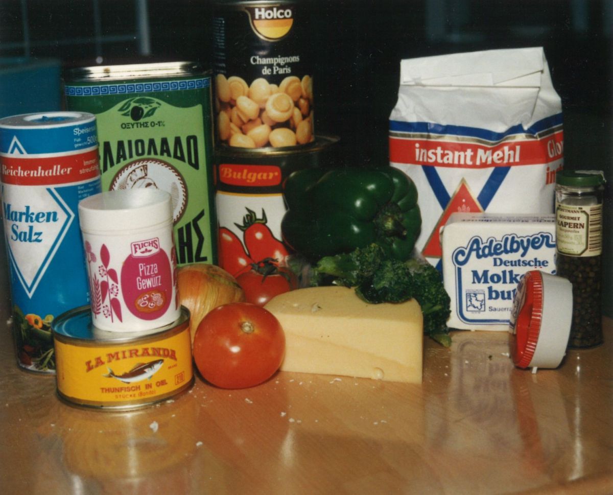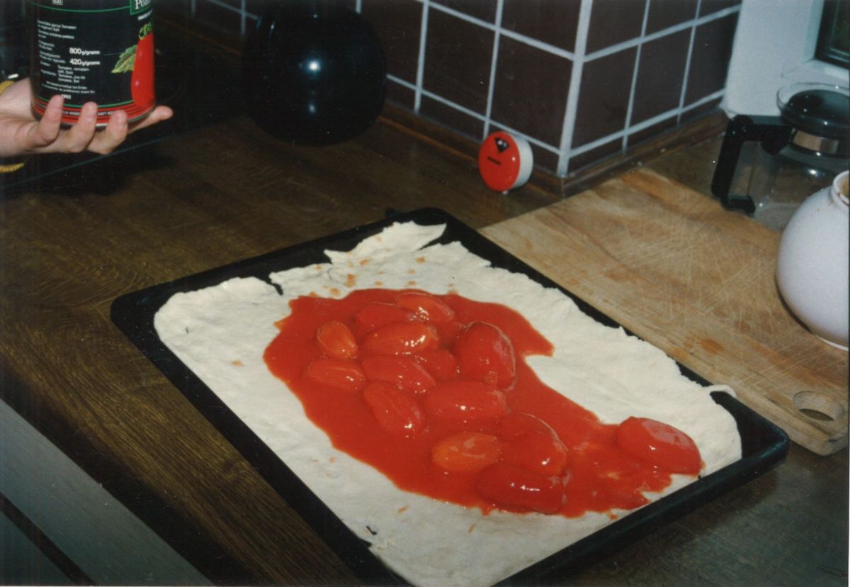 In der Wartezeit kann man schon diverse Büchsen öffnen, Paprika, Zwiebeln, gekochten Schinken/Salami klein schneiden und was einem noch so als Belag einfällt, vorbereiten. Nicht vergessen: den jungen Gouda raspeln! Und die verbleibende Zeit zum Staubsaugen verwenden oder anderen beliebten Tätigkeiten widmen.