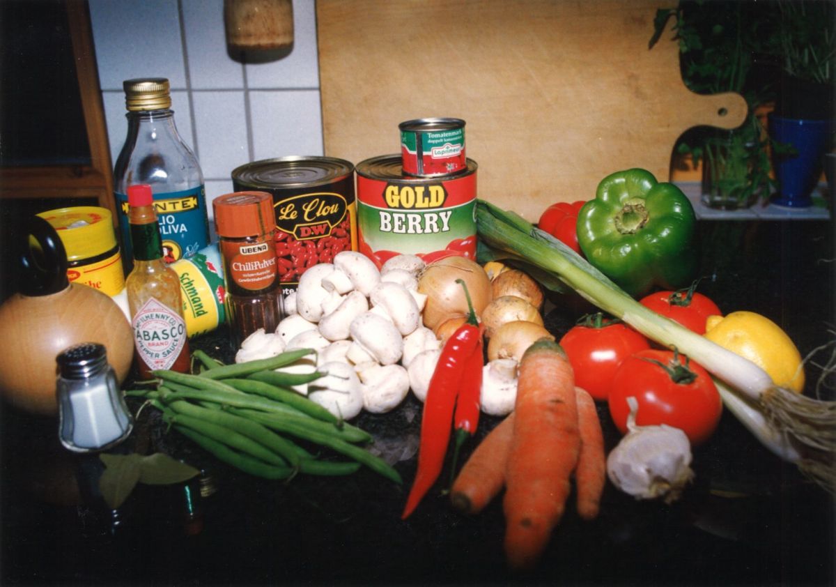 Von den Zutaten hängt wie immer das Ergebnis ab: 6 Zwiebeln grob hacken, 2 Möhren fein würfeln, 10 grüne Bohnen in kurze Schnipsel schneiden, eine grüne Paprika fein würfeln, 300g Champels fein hacken, ebenso 4 frische Tomaten. Je 1 große Dose Kidneybohnen und Schältomaten öffnen, desgleichen 1 kleine Dose Tomatenmark.