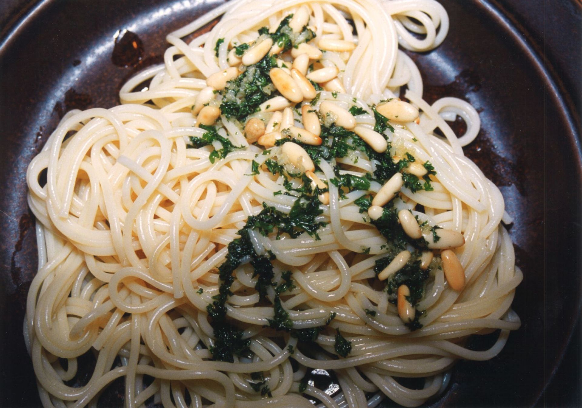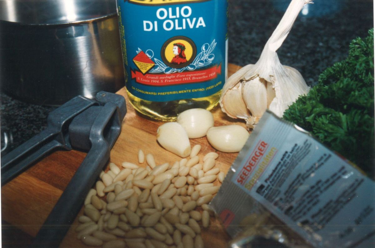 Kurz vor dem Abgießen der Nudeln reichlich Olivenöl erhitzen, einen Esslöffel voll Pinienkerne anrösten und nach Geschmack salzen. 5 große Knoblauchzehen mit der Presse zum Öl geben und jetzt nur sehr kurz anbraten lassen. Das dauert kaum eine Minute, wenn das Öl heiß ist – bitte bedenken, dass das heiße Öl auch weiter brutzelt, wenn es vom Herd ist – denn aus goldbraunem Knoblauch kann dann immer noch dunkelbrauner Brösel werden - also nicht ganz so heiß rangehen.