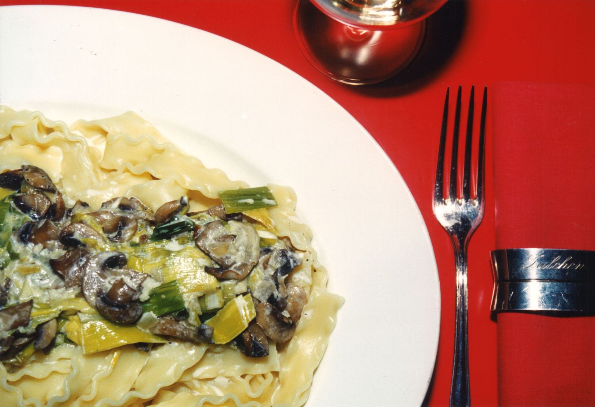 Nun geht´s los: Wasser für die Nudeln zum Kochen bringen und derweil die Champignon mit den Zwiebeln in Butter dünsten. Champignons schmecken besser, wenn sie gleich gesalzen werden – also Salz und Pfeffer schon in den ersten Anbratvorgang integrieren. Zügig den Lauch dazu und ruhig die Hitze unter dem Deckel nutzen um den Garvorgang zu beschleunigen, denn nun kocht das Wasser für die Bandnudeln. Hier fällt die Entscheidung heute schwerer: