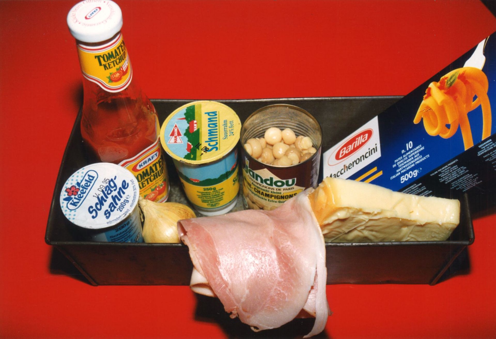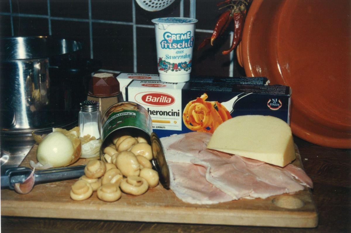 Also: Nudeln kochen mit 'nem bisschen Salz und Öl. Wenn das Wasser kocht, Nudeln rein und in einem zweiten Topf die klein geschnippelten Zwiebeln in Öl anbraten, bis sie glasig sind. Dann die Pilze auch anbraten. Dann kommt Schmand und Sahne in den Topf – einmal aufkochen lassen. Dann kommt der gekochte Schinken rein und es wird gewürzt. Und zwar: Pfeffer, Salz, Chinagewürz, Oregano und andere Kräuter nach Wahl. Man könnte auch ein bisschen Brühe reintun, das schmeckt bestimmt gut.