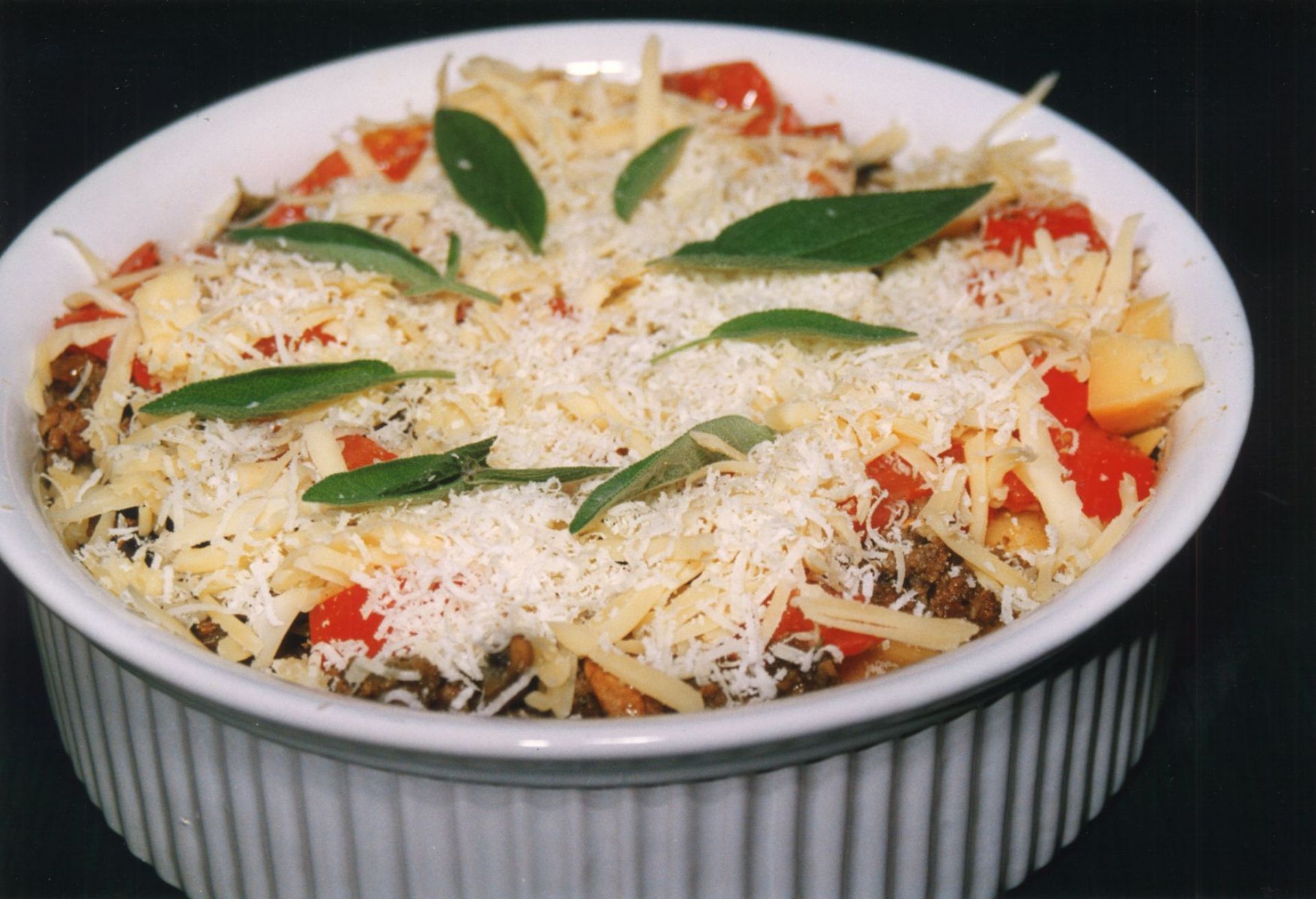 Kochen muss man die Zwischenlagen. Aus Hackfleisch, Pilzen (wenn man die Sorten immer mal wieder wechselt, kann man dieses Gericht 4 Wochen lang auftischen), Tomaten, Zwiebeln, Paprika nach Wunsch oder Aubergine, Knoblauch und Olivenöl zum anbraten. Gewürze sind wieder die typisch italienischen: z.B. die vorzügliche italienische Kräutermischung von Ubena aus Thymian, Oregano, Rosmarin, Basilikum, Majoran und Salbei. Dazu Salz und Pfeffer.