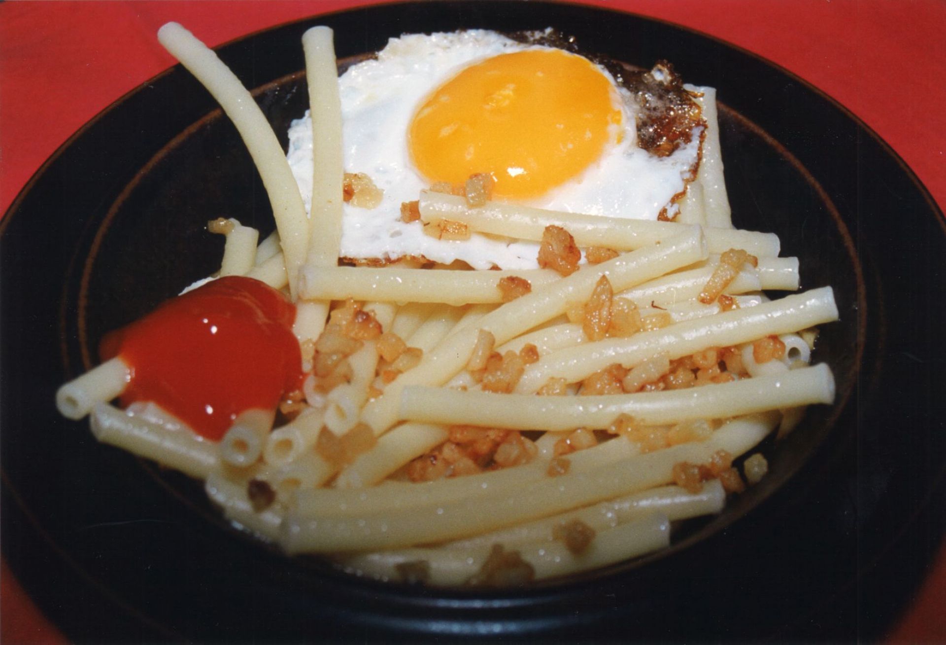 Maccheroni al dente kochen und die Kochzeit nutzen, um 50-100g fetten Speck zu würfeln und in einer kleinen Pfanne auszulassen, bis die Speckwürfel kross sind – dabei bedenken, dass das Fett die Hitze hält, auch wenn die Pfanne von der Platte ist, und die Speckwürfel daher noch verbrennen können. Das Auslassen geht ja erfahrungsgemäß recht schnell, und so sollte man die Platte erst anmachen, wenn die Nudeln fast gar sind: Speckpfanne anschalten, zweite Pfanne für Spiegelei anschalten, Maccheroni abgießen und im Topf mit Deckel zurück auf der ausgeschalteten Herdplatte warm stellen - dabei Speckwache halten. Spiegelei ansetzen. Rechtzeitig die Nudeln in eine Schüssel geben oder gleich auf Teller verteilen.