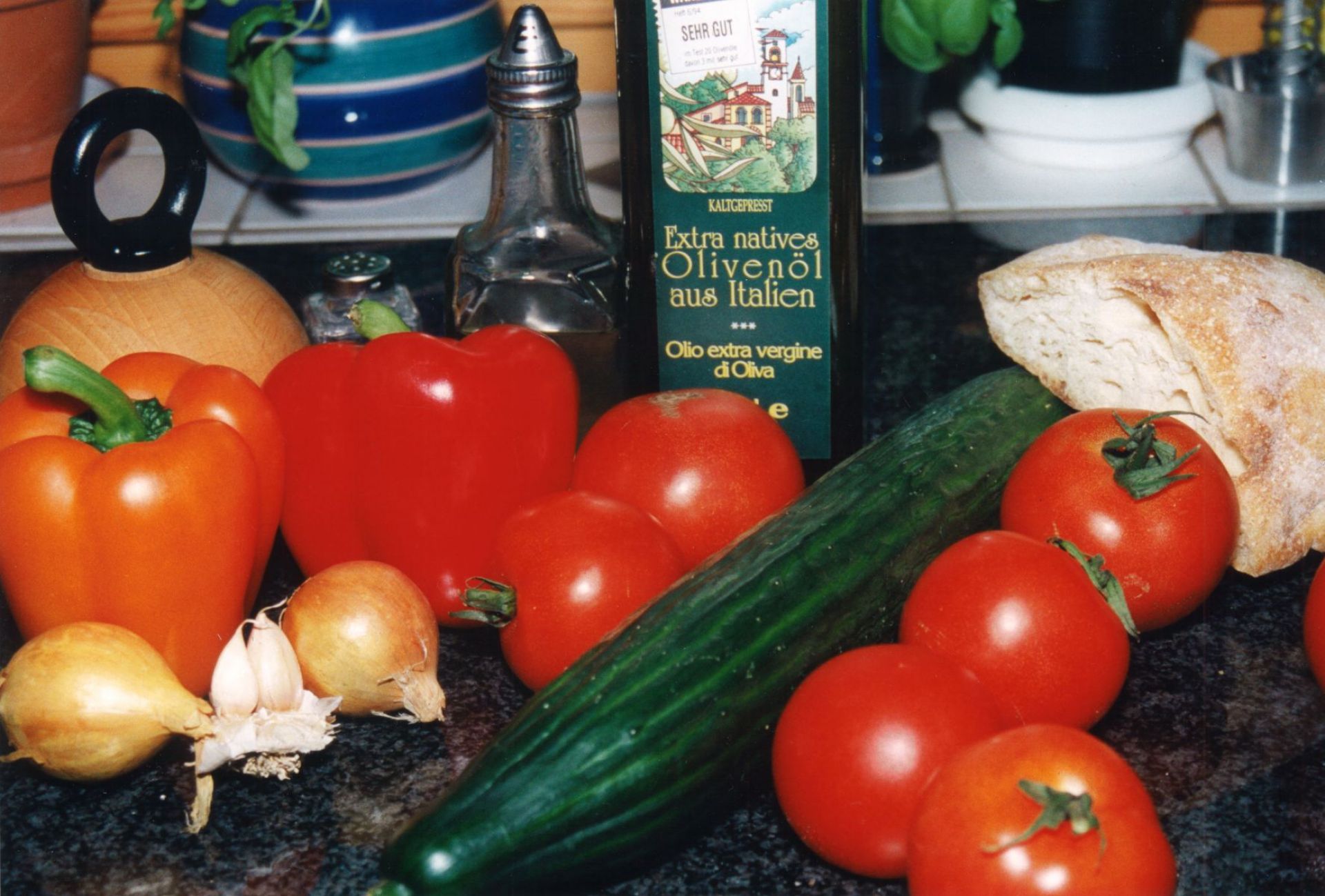 1 Knoblauchzehe, 1 Zwiebel, 2 rote Paprika, 1 Salatgurke, 6 Tomaten, 1 Scheibe Toast, 3 EL Olivenöl, 1 EL Essig, ¼ l Eiswasser, Salz+Pfeffer, (Kräuter, vor allem Petersilie)