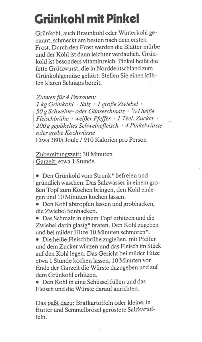 Grünkohl, auch Braunkohl oder Winterkohl genannt, schmeckt am besten nach dem ersten Frost. Durch den Frost werden die Blätter mürbe und der Kohl ist dann leichter verdaulich. Grühnkohl ist besonders vitmaninreich. Pinkel heißt die fette Grützwurst, die in Norddeutschland zum Grünkohlgemüse gehört. Stellen Sie einen kühlen klaren Schnaps bereit.
