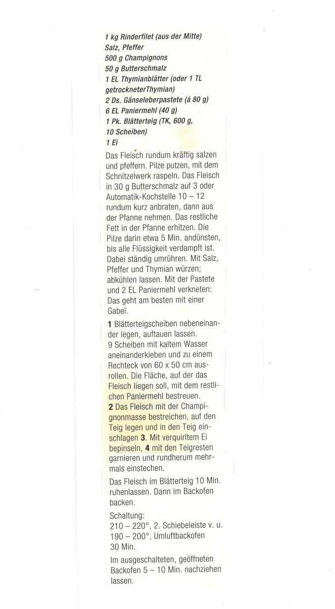 Das Fleisch im Blätterteig 10 Min ruhenlassen. Dann im Backofen backen.