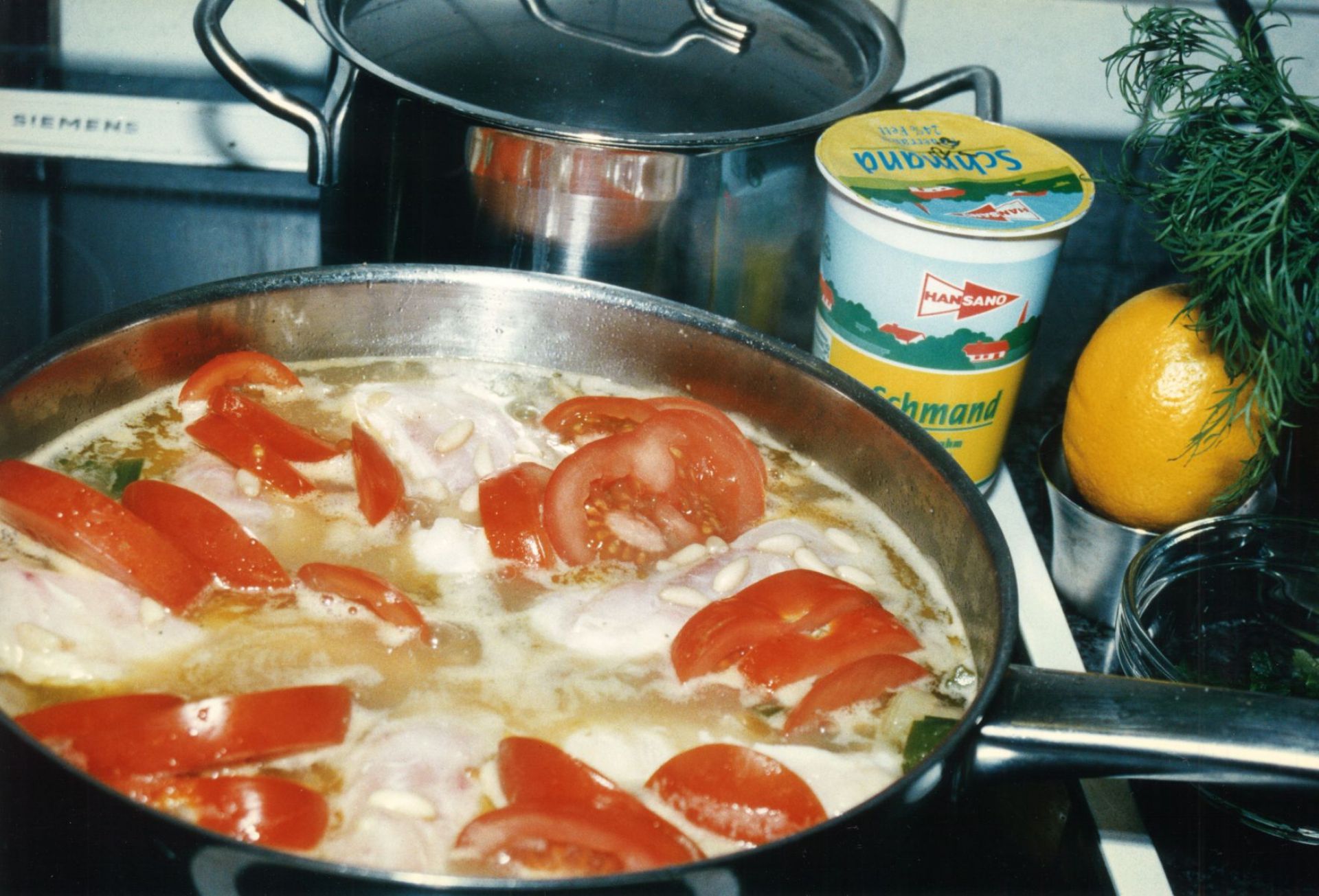 Jetzt die Fische waschen und in Stücke schneiden, mit Zitronensaft beträufeln und salzen. Den Sellerie, die Wurzeln und den Lauch putzen, waschen und kleinschneiden. Die Butter in einem großen Topf oder großen Pfanne erhitzen und das Gemüse darin andünsten. Die Fischstücke drauflegen. Die Fischbrühe absieben oder den Deckel vom Fischfondglas öffnen und ¼ l davon über den Fisch gießen. Den Fisch auf dem Gemüsebett 15 Minuten köcheln lassen. Tomatenspalten dekorativ verteilen und kurz mitköcheln lassen. Die Eigelbe mit der Sahne verquirlen. Die übrige Fischbrühe einige Minuten kräftig durchkochen, dann 2 EL davon mit dem Ei-Sahne-Gemisch verrühren, die Brühe vom Herd nehmen und mit der ‘Ei-Sahne-Brühe’ legieren. Mit Salz und etwas geriebenem Muskat abschmecken. Diese Soße nun über den gegarten Fisch in der Pfanne gießen.