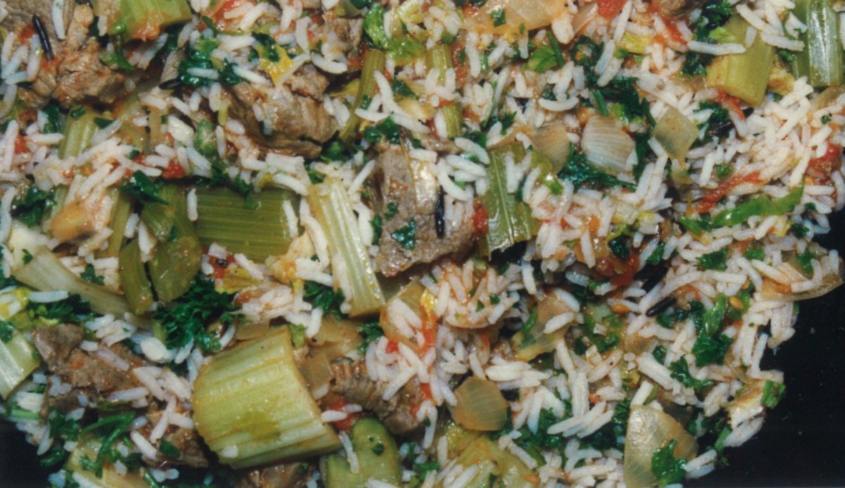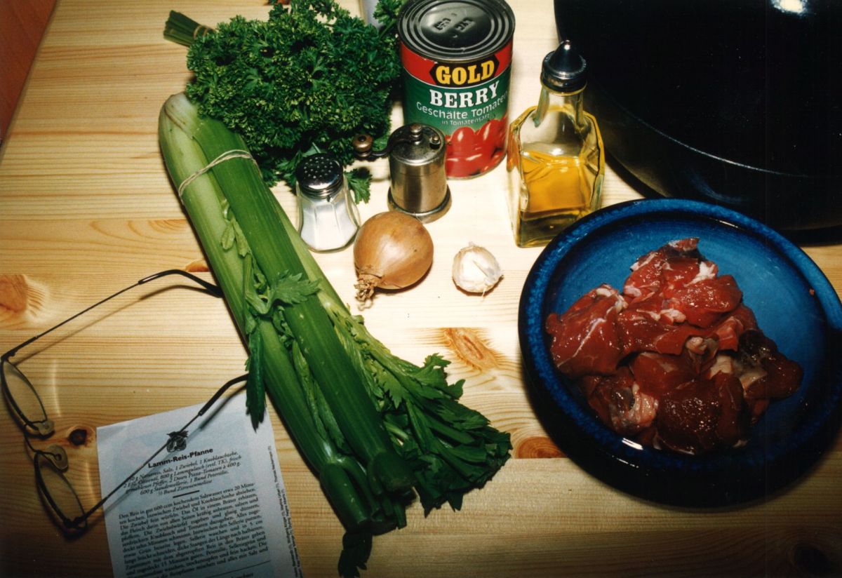 Den Reis in kochendem Salzwasser etwa 10 - 15 Minuten kochen (Naturreis 30 Min!). Inzwischen Zwiebel und Knoblauchzehe abziehen. Die Zwiebel fein würfeln. Das Öl in einem Bratentopf erhitzen, das Fleisch darin von allen Seiten kräftig anbraten, salzen und pfeffern. Die Zwiebelwürfel zugeben und glasig dünsten, zerdrückten Knoblauch und Tomaten dazugeben. Alles zugedeckt zehn Minuten schmoren. Inzwischen den Bleich-Sellerie putzen, etwas Blatt-Grün beiseite legen. Sellerie waschen und in 4 cm lange Stücke schneiden, dicke Stangen der Länge nach halbieren. Zusammen mit dem abgetropften Reis in den Bräter geben und zugedeckt 15 Minuten garen. Petersilie, Selleriegrün und Zitronenmelisse waschen, trockentupfen und fein hacken. Die Kräuter unter die Reispfanne mischen und alles mit Salz und Pfeffer abschmecken.
