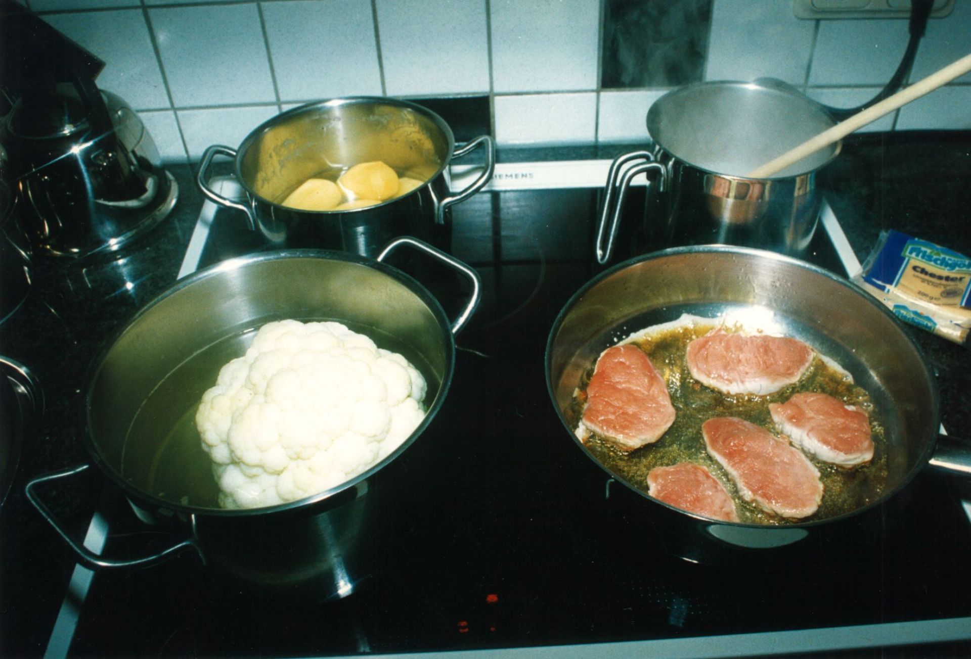 Bei der Auswahl des Ladens für den Einkauf der Zutaten ist unbedingt darauf zu achten, daß Scheibletten von KRAFT Sorte „Chester“ geführt werden, sonst sind weitere Gänge notwendig. Der Chester kommt ins Spiel, wenn alle Gäste überraschend doch schon da sind und der Tisch gedeckt ist. Kartoffeln und Blumenkohl sind im Backofen warmgestellt und über die appetitlich braun gebratenen Lendchen werden je eine Scheiblette gebreitet. Der Deckel kommt über die Pfanne und hilft beim Schmelzprozeß. Nicht mit zuviel Hitze nachhelfen, dann wird’s nix. Der Käse schmilzt in einem langsamen Prozeß, der auch den schon geschmolzenen Käse am Pfannengrund erfaßt und besonders diesen krustig anbräunt. Den richtigen Zeitpunkt abpassen und auch die überbackenen Lendchen warm stellen.