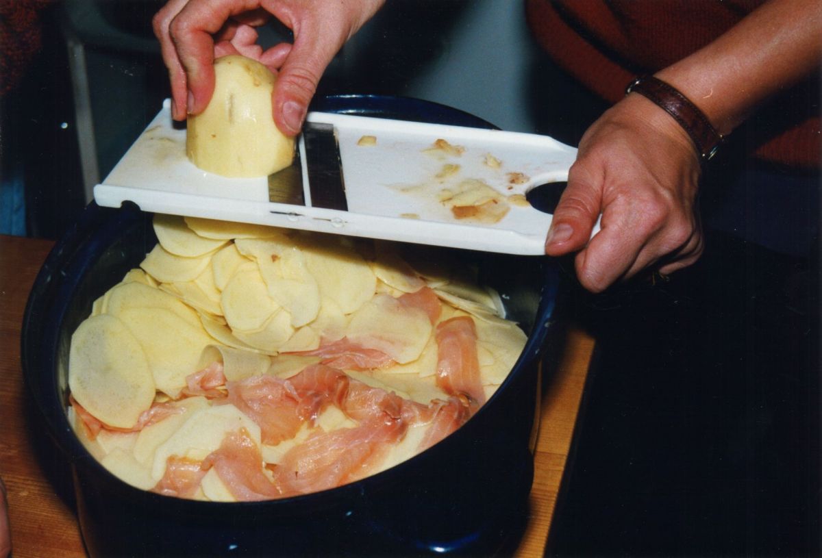 Kartoffeln müssen geschält und dünn gehobelt werden. Damit Zeit gespart wird, am Besten gleich in die flache, große, ovale, gefettete Auflaufform hobeln und schichten mit der weiteren Zutat: geräucherter Lachs - in Streifen geschnitten.