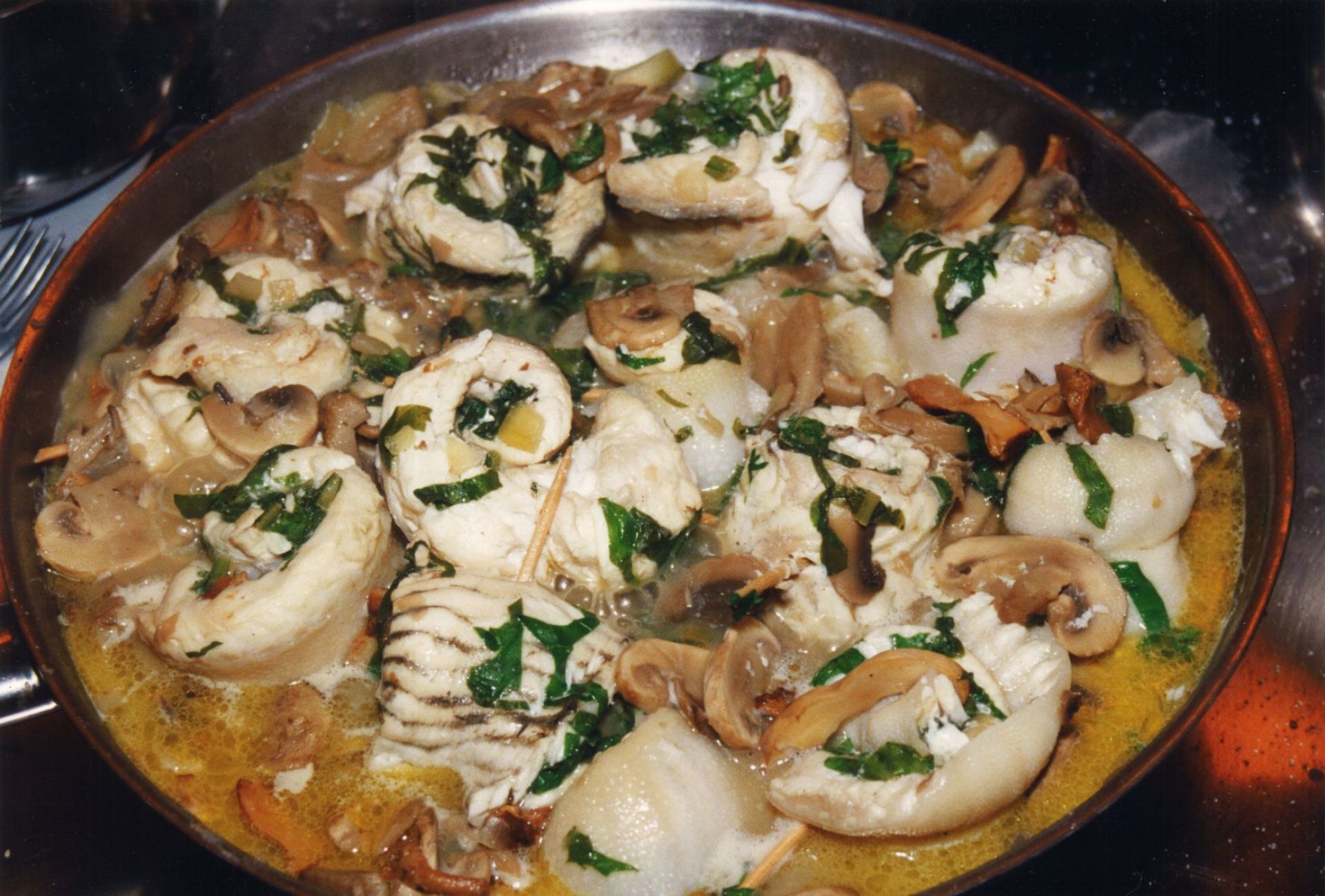 Die Röllchen werden nun in den Pilz/Sahnesud gestellt und bei schwacher Hitze in 10 Minuten gar gezogen. Ein Deckel wäre an dieser Stelle hilfreich.