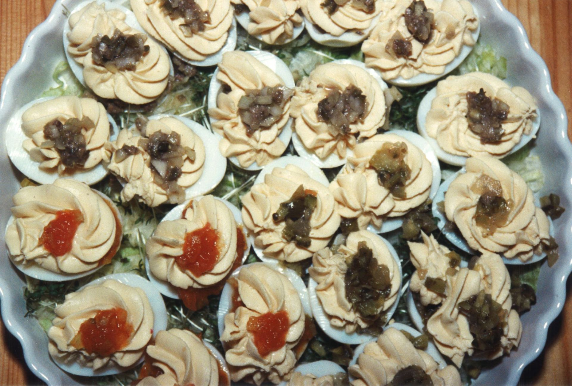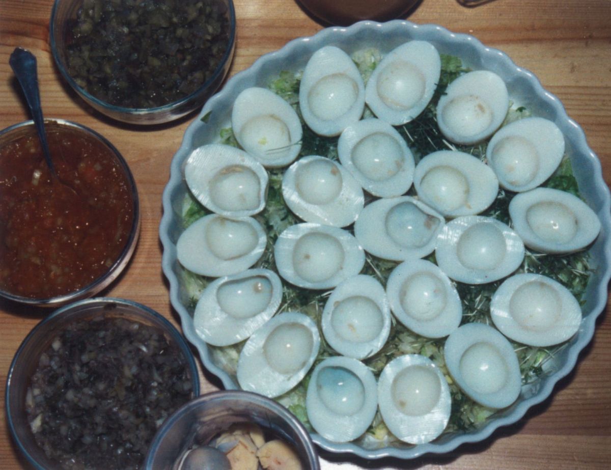 Die unten beschriebenen Füllungen zubereiten. Die Eihälften mit den Füllungen füllen, das gewürzte Eigelb in einen Spritzbeutel geben (kann man im Museum leihen, d. Red.), einen Ring auf die gefüllten Eier spritzen, in die Mitte noch etwas der jeweiligen Füllungen geben.