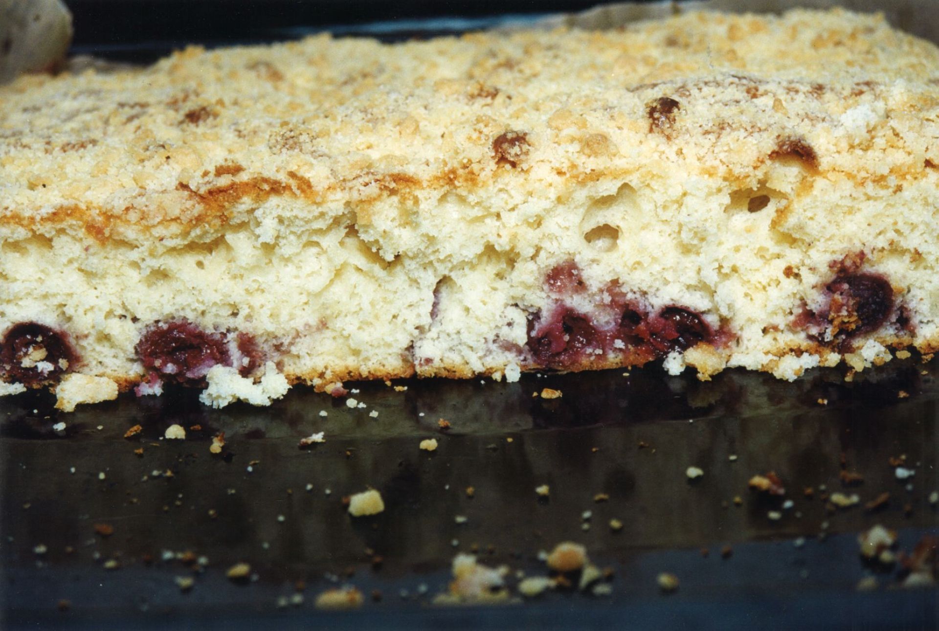 Zu meinem und Eurem Glück war aber auch was Brauchbares dabei: dieser einfache, schnell herzustellende, gut einfrierbare und nicht zuletzt wohlschmeckende Kirschstreuselkuchen!
