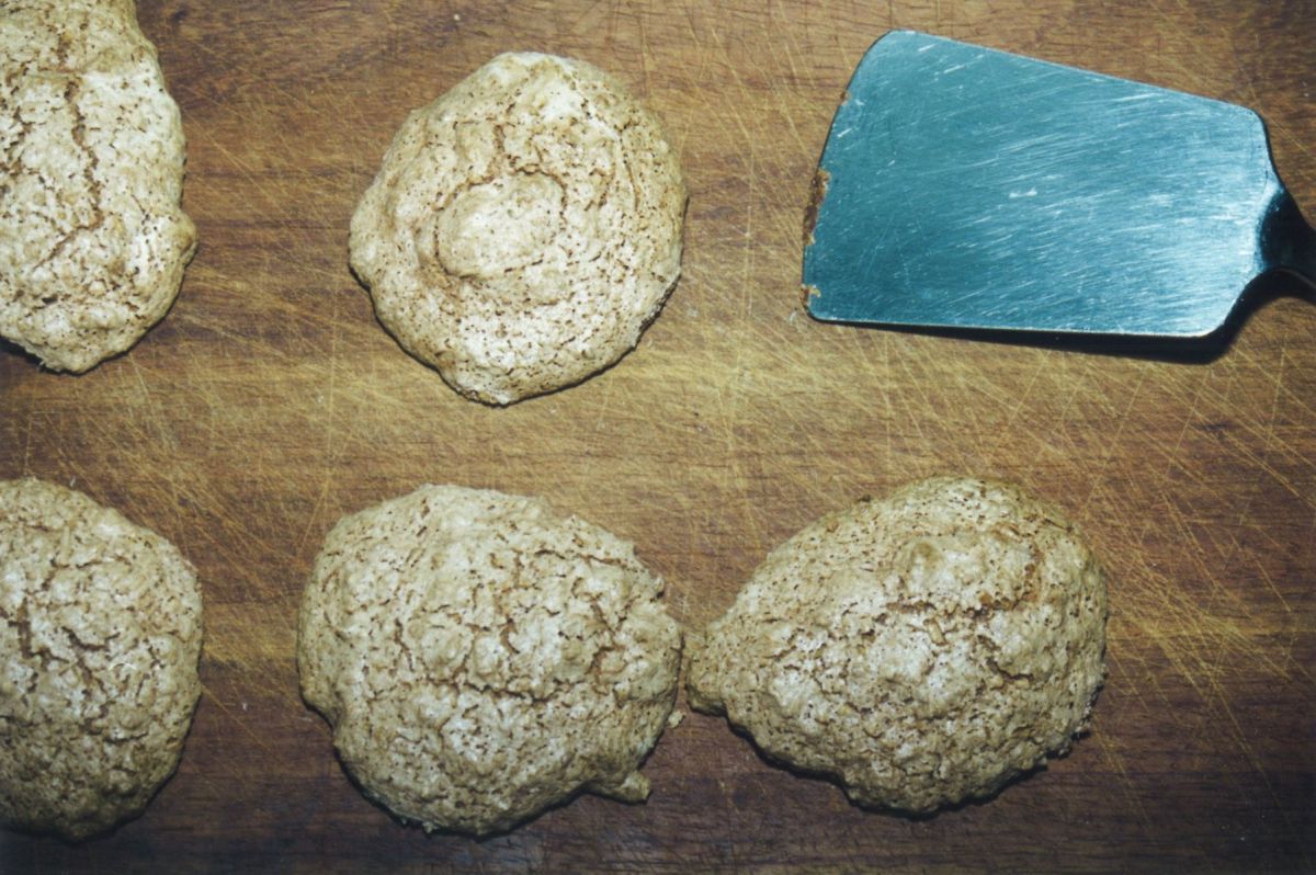 Auf ein gefettetes Backblech oder Backpapier werden nun in ausreichend Abstand Häufchen aus ca 2 Teelöffeln Klebmasse gemacht und bei vorgeheizten 175oC in 15 Minuten klebrig-saftig gebacken oder in 25 Minuten beseéartig oder mit Mehl im Teig eher keksig.