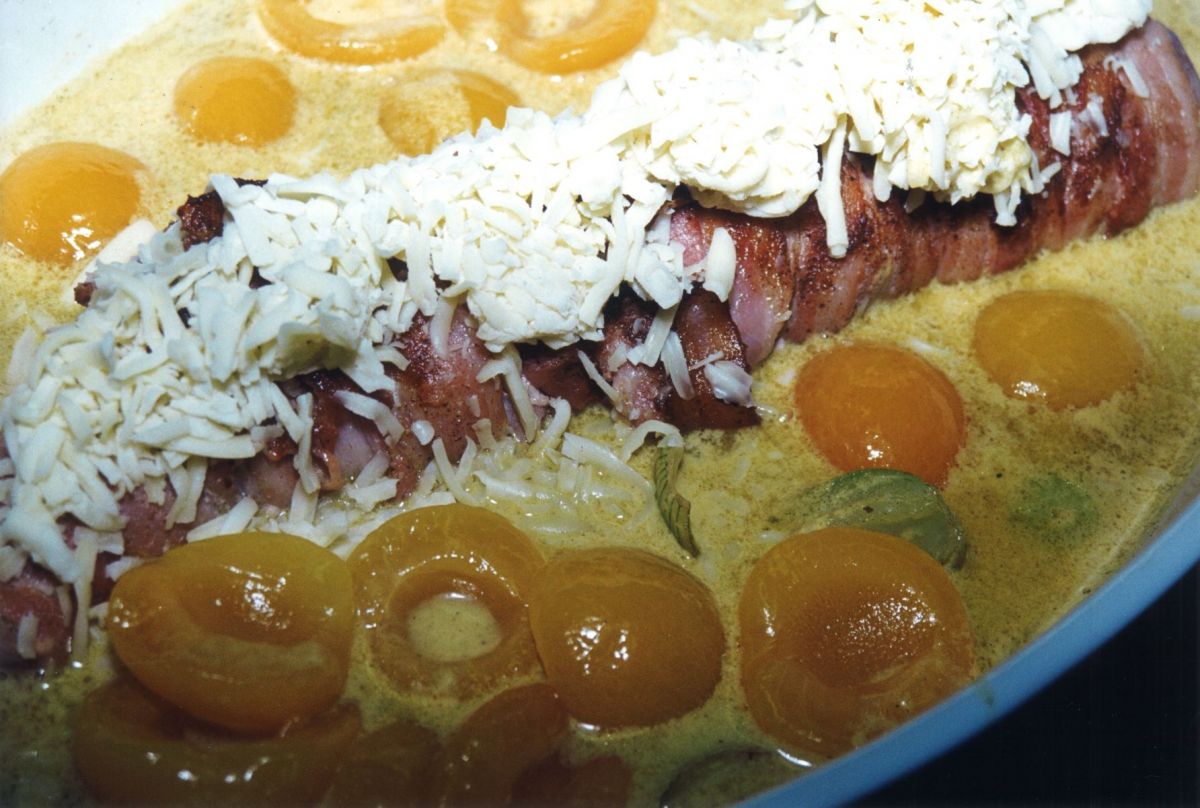 Nun denn: Besser als auf dem Foto, hatte Susanne die Schweinefilets einzeln in den dänischen Frühstücksspeck gewickelt (Tulip-Bacon) und scharf angebraten. Dann nimmt Susanne die „Dinger“ - wie sie ihr Machwerk geringschätzig bezeichnet – aus der Pfanne und löst den Bratensatz (das angebrannte Zeugs) mit je 150 ml Sahne und Saft aus der Aprikosendose (egal, Pfirsich geht auch). Mit Pfeffer und Curry abschmecken und ungefähr 200g Fleisch pro Person einplanen. Dazu gibt’s Baguette und Salat oder Kartoffeln und Salat, aber Baguette und Salat ist für Susanne doch eher OK. Vom Curry nimmt man etwa ½ oder ¾ Teelöffel und kein Salz wegen des Bacon und bei 4 Personen kann man auch eher in 2 Pfannen braten. Susanne: Käse rüberrebbeln und 10-20 Minuten in den Ofen – da ist doch wirklich nix dran.
