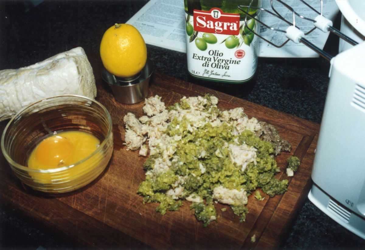 Im Kochbuch steht zwar „inzwischen“ den Tunfisch, die Sardellenfilets, die Kapern und die Cornichons im Blitzhacker zerkleinern – aber so lange dauert es doch nicht und die Zeitplanung sollte sich daher eher am Zeitpunkt des Essens orientieren. 5 Stunden vorher sollte die Soße auf dem dünn aufgeschnittenen Kalbfleisch sein Aroma entfalten können: