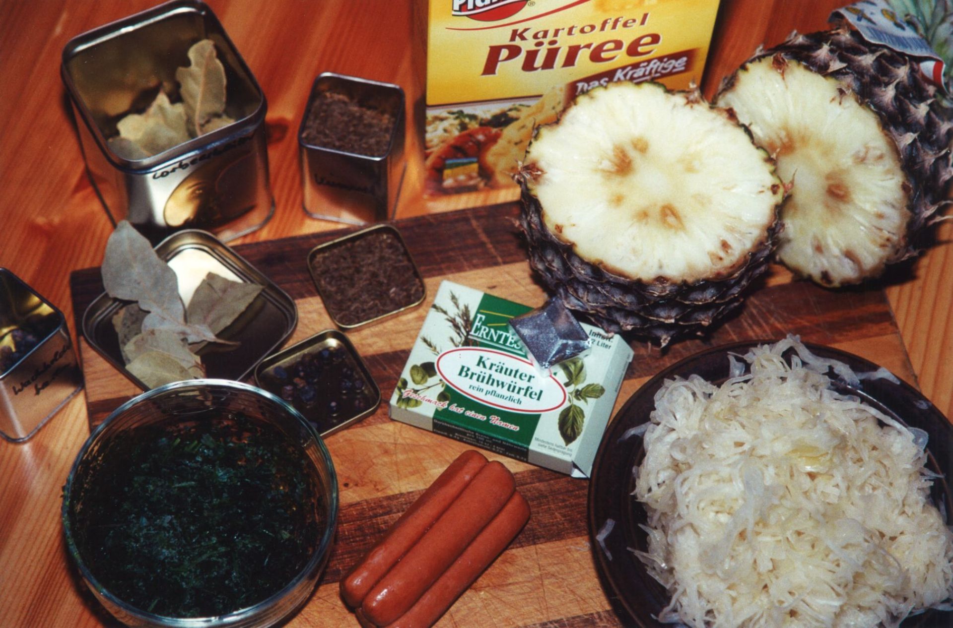 Wie immer bei der Brigitte ist die 1 Tasse Gemüse-Hefebrühe ein Muss, dazu kommt 1 kleines Lorbeerblatt, 1 Teelöffelspitze??? Kümmel, 2 Wachholderbeeren für die 250g Sauerkraut. Ansonsten 120g Ananas als ökologischen Sündenfall – wenn nicht frisch, dann die von Libby‘s ohne zusätzlichen Zucker (aber immerhin von FAMILA, und der Laden ist wieder heimisch), 2 Würstchen, Petersilie, Salz (Kartoffelpüree)