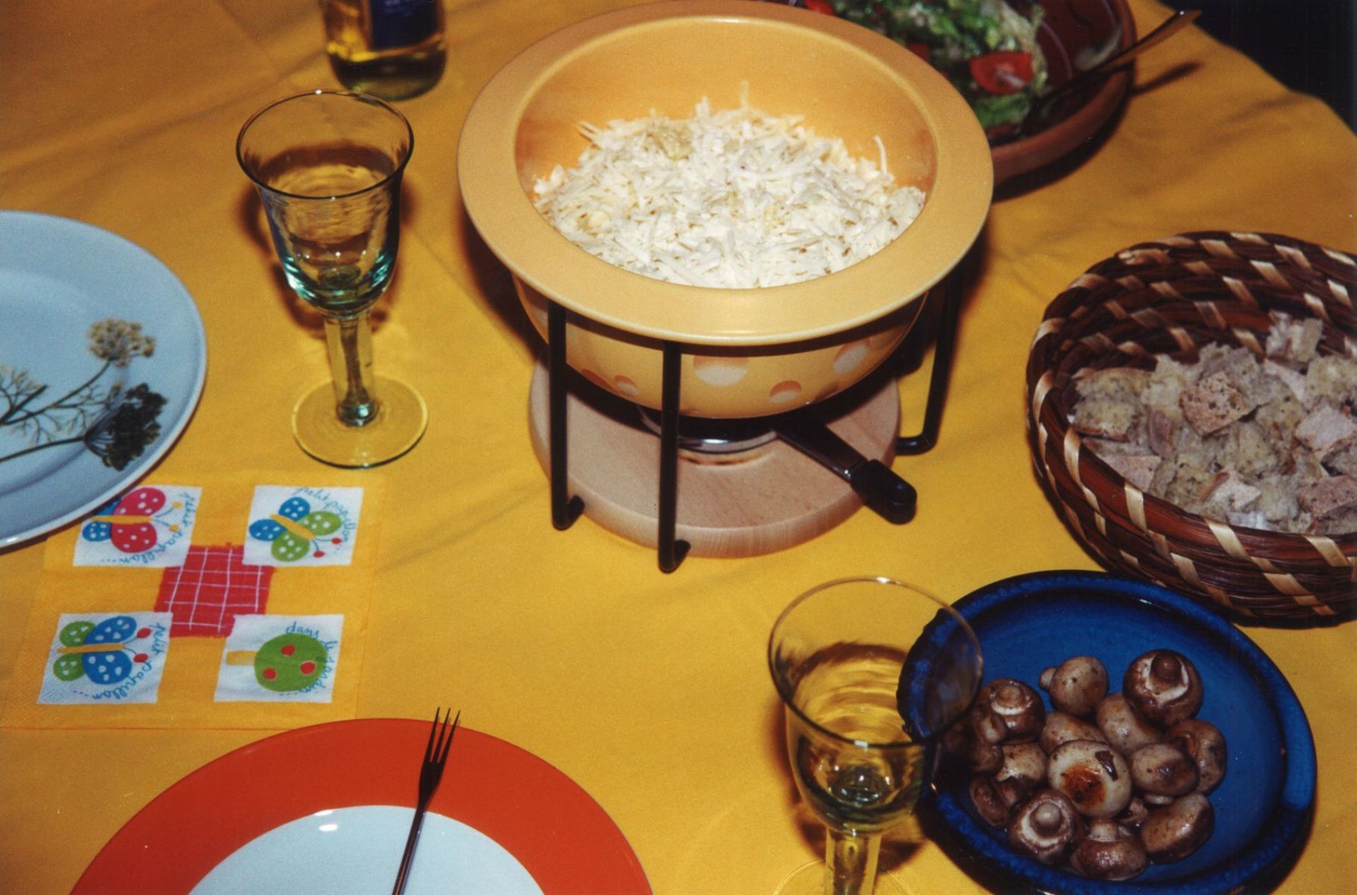 Dieser wird mit dem Knoblauch ausgerieben, der Käse reingerieben, die Speisestärke – zunächst im Zitronensaft und Weißwein angerührt – dazu und gleich bei großer Hitze unter umrühren (Schneebesen) aufgekocht. Jetzt Kirschwasser dazu, Pfeffer und Muskatnuss und leicht köcheln lassen, bis der Rechaud bei Tisch betriebsbereit ist.