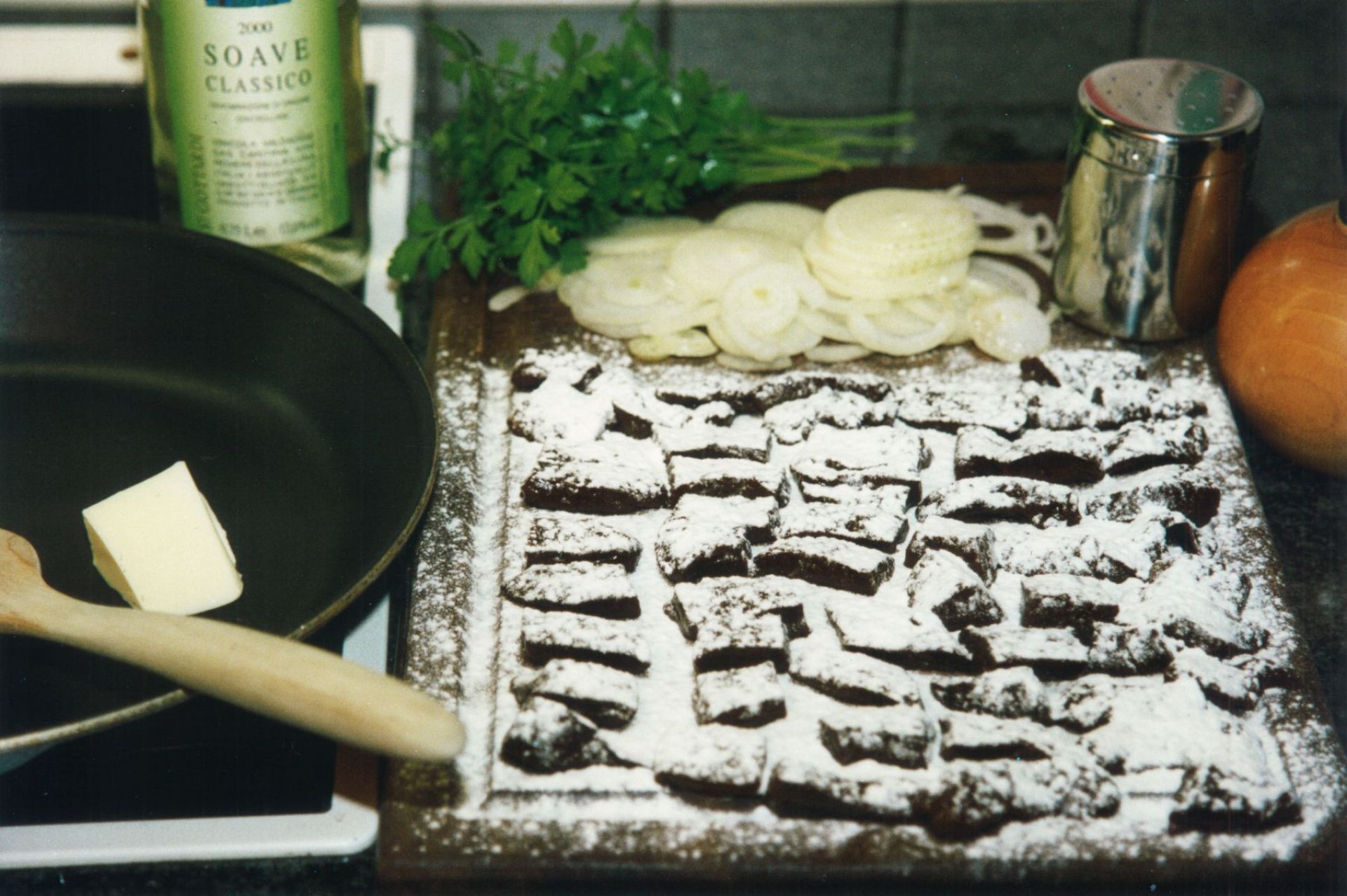 Die Kalbsleber (nicht ganz billig!) kalt abspülen, trocknen und in kinderdaumendicke Stücke schneiden – gewöhnungsbedürftig, aber für einen Kinderchirurgen sicherlich eine angemessene Maßeinheit. - Die Leberstücke werden dünn mit Mehl bestäubt – nicht ‚gewälzt‘, wie es noch die Großmütter taten – um dann in erhitzter Butter unter Wenden sanft angebraten zu werden. Die vorbereiteten Zwiebelringe werden nicht zu früh untergemischt und mitgebraten – dadurch werden sie nicht braun und das soll auch so sein. Nun wird der Wein angegossen und mit der Leber 5 Minuten sacht geköchelt. Die Sahne einrühren und mit Salz und Pfeffer abschmecken.