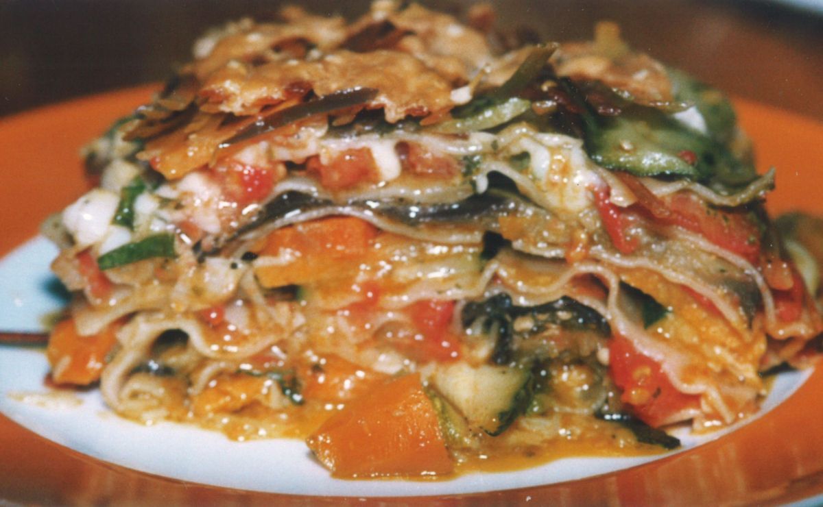Diese vegetarische Lasagne überrascht durch die luftige Schichtung, die trotzdem zu garen Nudelzwischenlagen führt. Das Gemüse wird in einer Fettpfanne im Backofen vorgegart und behält eine durchaus erkennbar große Eigenform.