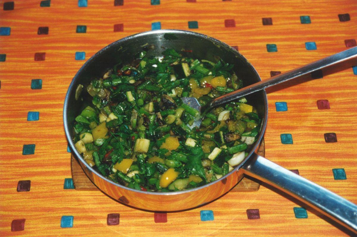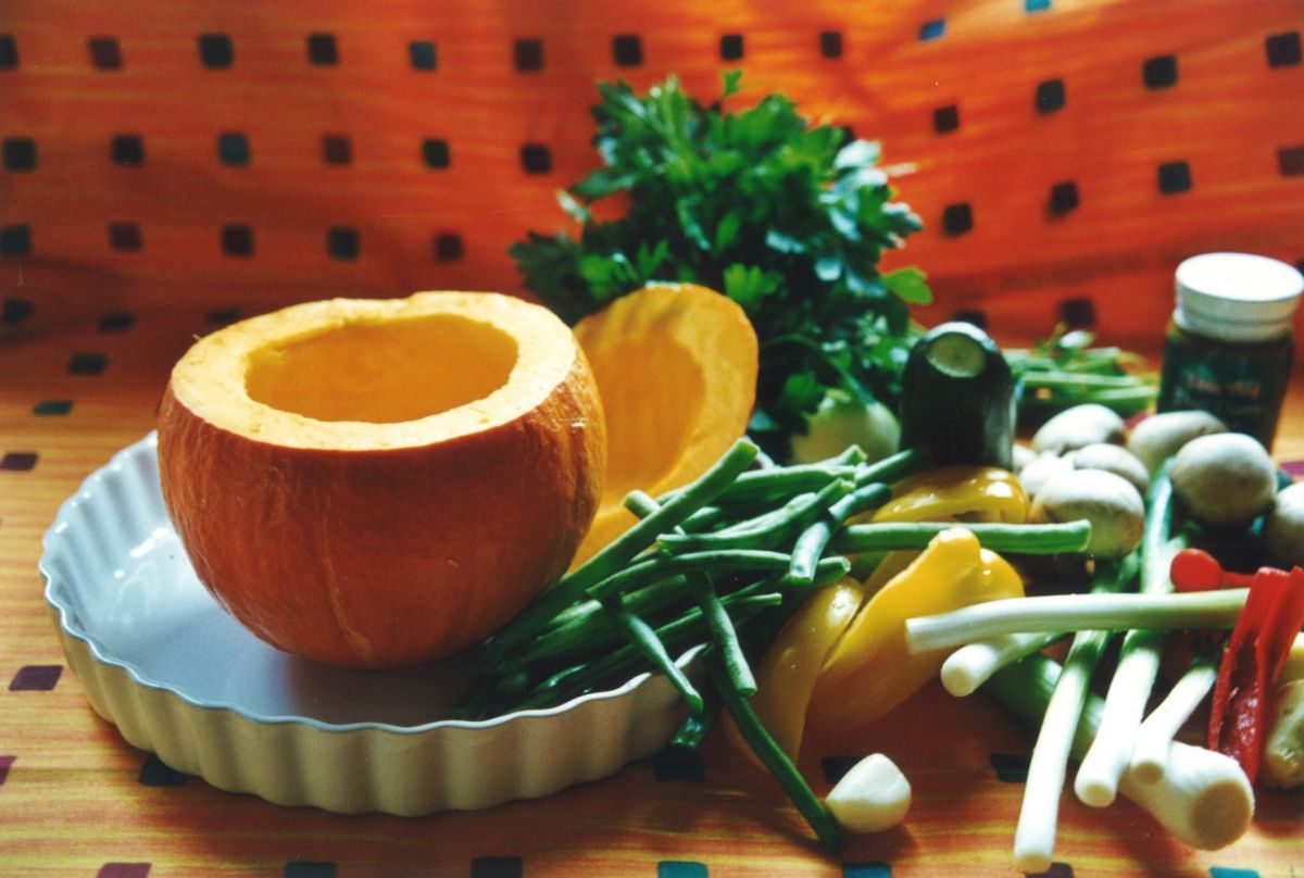 Nun ist genug Zeit für die Füllung. Was der Markt hergibt kann geschnipselt und vorgebraten werden. Gebratenes Gemüse ist doch etwas würziger, als der reine Garprozess im Kürbis. Raffiniert zeigt sich hier die thailändische Currypaste, die Geschmack und Schärfe ins Essen bringt und gut durch frisch geriebenen Ingwer ergänzt werden kann. Gut geht auch die ganze Würzpalette rund um den Wok – oder nehmt ihr nur Maggi?