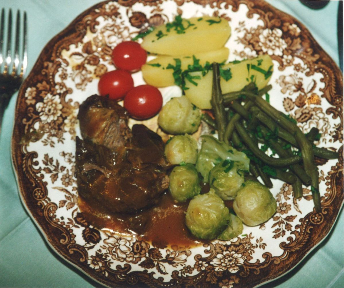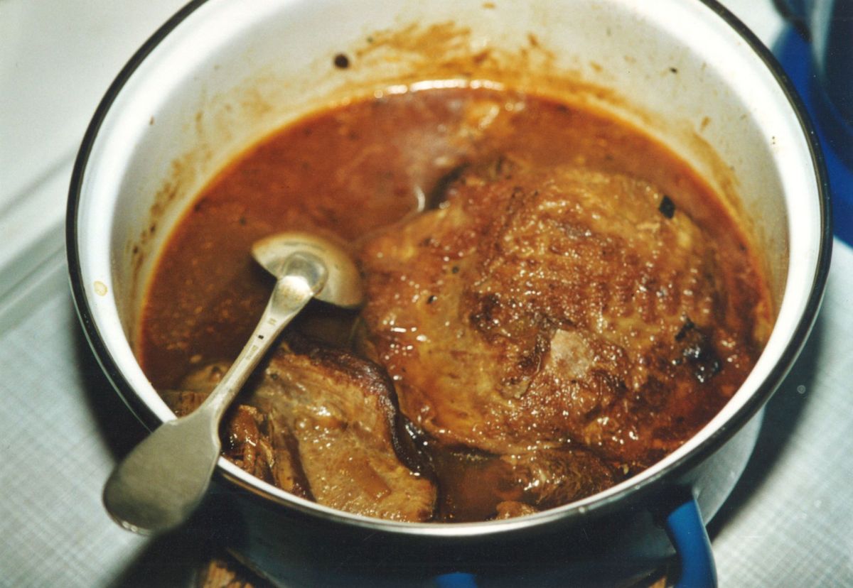 Gar ist das Fleisch, wenn man mit der Gabel reinpieken kann. Wenn das soweit ist, kommt das Fleisch raus - die Soße soll erkalten und das Fett kann abgeschöpft werden. Ist sie zu flüssig, kann noch einmal Mehl angestäubt werden.