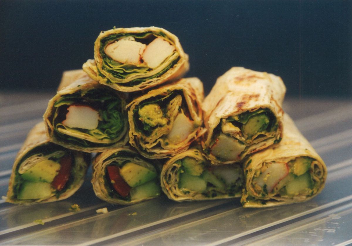 Die heißen Weizenteig Tortillas kurz erhitzen (ggf. warm stellen – solange sie warm sind, lassen sie sich rollen!), mit der grünen Paste bestreichen, die Basilikumblätter, Gemüse und anderen Zutatenstreifen auflegen und rollen. Mit einem scharfen Messer schräg in Teile schneiden – und genießen.