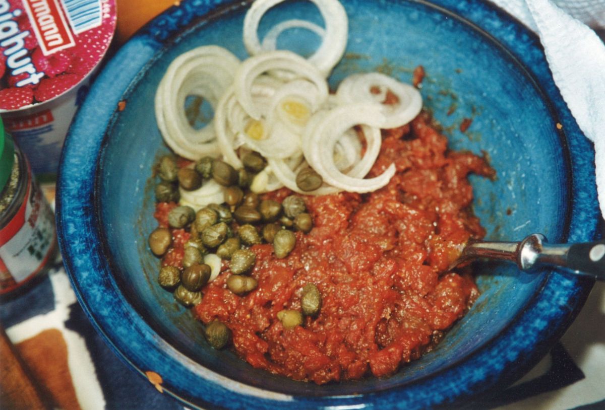 2. 125g Tartar (Beefsteakhack, Schabefleisch) mit einem Eigelb, Pfeffer und Salz vermengen und je 1 Häufchen Zwiebelringe/-würfel und Kapern dazu.