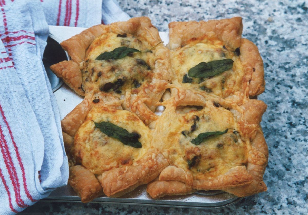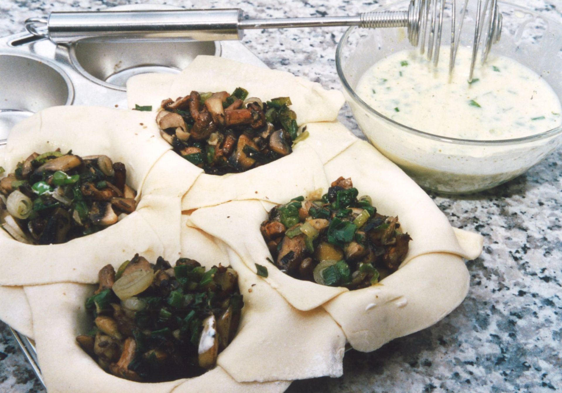 Die Champignons putzen und grob hacken, die Lauchzwiebeln dito, dann in Ringe schneiden. Beide in Butter andünsten, pfeffern und salzen und nach Verlust der Flüssigkeit den quer in Streifen geschnittenen Salbei hinzufügen (Salbei wird immer mitgekocht oder -gebraten). Natürlich werden einige Blätter für Dekorationszwecke heil gelassen und beiseite gelegt. Nun die Eier und die saure Sahne verquirlen und etwas würzen.