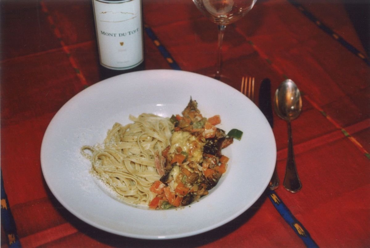 Dazu gibt es Bandnudeln mit Pesto und Butter vermengt und etwas Knoblauch mit frischem Parmesan. "Das isses", bemerkt die gelassene Köchin im größten Trubel, "schiebst es nur rein, das kannste immer vorbereiten." Damit ist ein weiteres tiefes Geheimnis gelüftet: 1. von langer Hand vorbereiten, 2. flexibel auf noch Vorhandenes zurückgreifen und 3. immer den Backofen benutzen, denn da kann alles noch "resten" (warm gehalten werden), bis sich alle eingefunden haben - so gelingen Familientreffen!