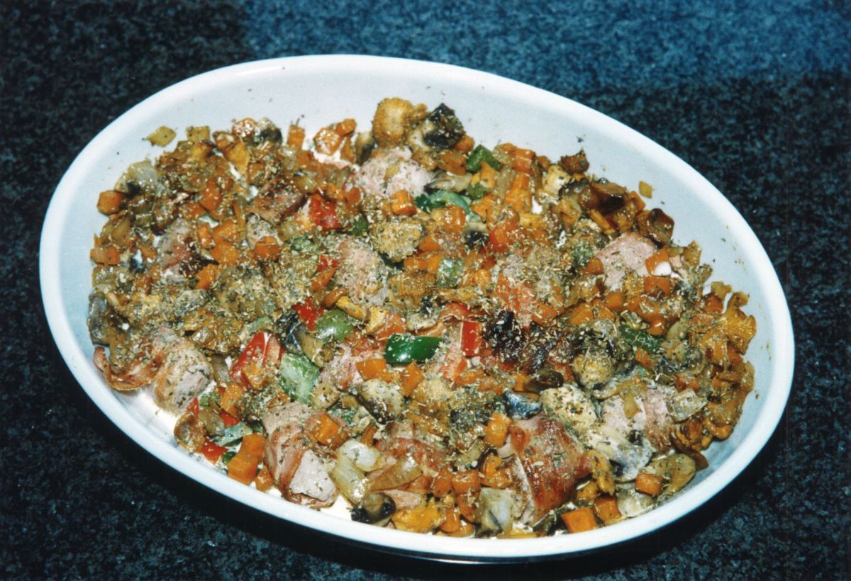 Wenn sich bei Tine die Familie ansagt, dann liegen auf dem Küchentisch immer viele spannende Zettelchen, Zeitungsausschnitte oder Kopien mit Rezepten und bereits dadurch ist wieder eine kulinarische Überraschung gesichert. Man muss sich allerdings damit arrangieren, dass Mengenangaben völlig nebensächlich sind, denn Planung ist für Tine kaum möglich. Bis zur letzten Minute bleibt unklar, wer sich alles einfindet, ob Hunger mitgebracht wird oder weitere Esser und ob der Tisch ausgezogen wird oder noch Hocker aus der Küche geholt werden müssen. Sicher kann manchmal nur der Gast sein, dass er letztlich satt wird, denn im entscheidenden Krisenfall hält sich die Familie zurück, ist bereits von wenigen Happen gesättigt und daher reicht das Essen immer. Diese Tugend muss aber selten gezeigt werden, denn das Improvisieren in der Küche gehört zu den ganz großen Stärken der Mostler'schen Küche. Mit Blick auf die erwarteten Gäste plane man also den Einkauf umsichtig: Putenbrustfiletstücke werden mit dünn geschnittenem geräuchertem Frühstücksspeck umwickelt (eigentlich sollte es Lachsschinken sein, aber den hat der Besuch am Morgen völlig überraschend restlos verbraucht!).