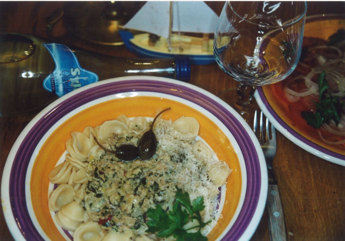 Dies ist schon fast alles. Nudeln auf dem Teller anrichten, Tunfischsoße dazu und als Krönung jungen, frischen Lister Parmesan drüber reiben und mit einigen Archsumer Kapernäpfeln dekorieren.