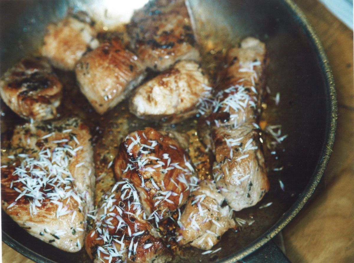 Gebraten wird dann nach frühestens drei Stunden in Olivenöl. Die Zwischenzeit kann sinnvoll genutzt werden. Es gibt Kartoffeln dazu und Quark / Joghurt / TK 8-Kräuter von ALDI dazu einen Salat mit Zutaten nach eigener Wahl. Wir wurden überrascht mit Feldsalat und gebratenen Champels.