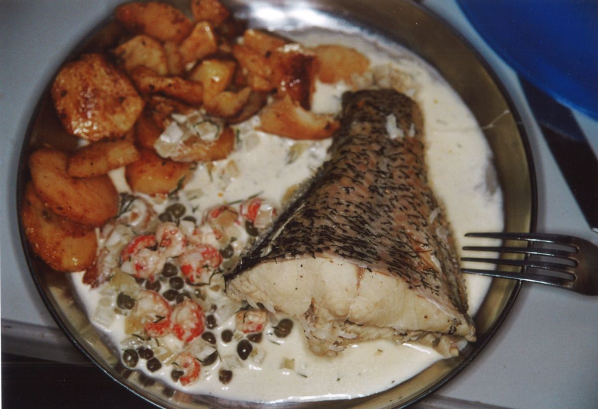 Feine Zwiebeln und Knoblauch werden in Butter angedünstet – dann mit Weißwein abgelöscht. Dazu 1 Becher Sahne - oder auch zwei, ein TL gekörnte Brühe (oder auch vom Hechtsud?), viele, viele Kapern und ein, zwei Bund Dill geschnitten. Dazu jetzt ganz nach eigenem Geschmack: Scampi, Tiefseekrabben, Nordseekrabben oder Krebsfleisch. Leicht in der fertigen Soße ziehen lassen und mit dem Hecht, Kartoffeln und grünem Salat servieren.