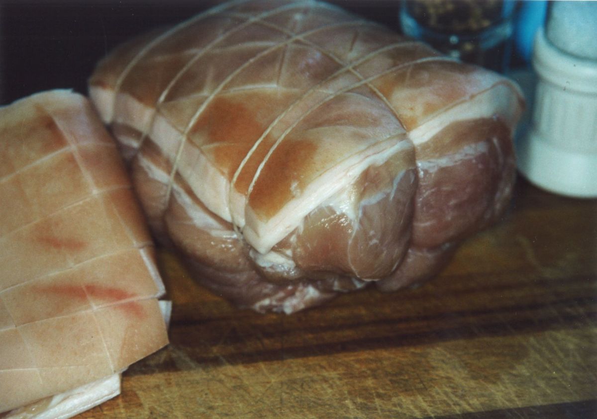 Dort also kauft man seinen Schweinebraten. 1 bis 1,5 kg sollte er haben und reicht dann gut für 4 bis 6 Personen. Dass es für 6 Personen reichen soll, darf man im Laden aber nicht sagen, denn dort gelten alle als „gute Esser“ und der Braten wiegt dann unweigerlich 1,8 kg – ein besonders schönes Stück.