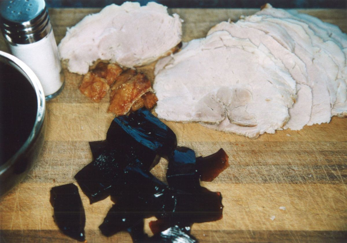 1 Tütchen weiße Gelatine nicht wie angegeben mit 0,5 l, sondern nur mit 0,2 l Flüssigkeit ansetzen (Würstchenwasser da? Oder etwas Bratensud nehmen?) und kräftig Maggi aus der Flasche dazu. Da darf man nicht zimperlich mit sein – kann aber zwischendurch die Intensität abschmecken.