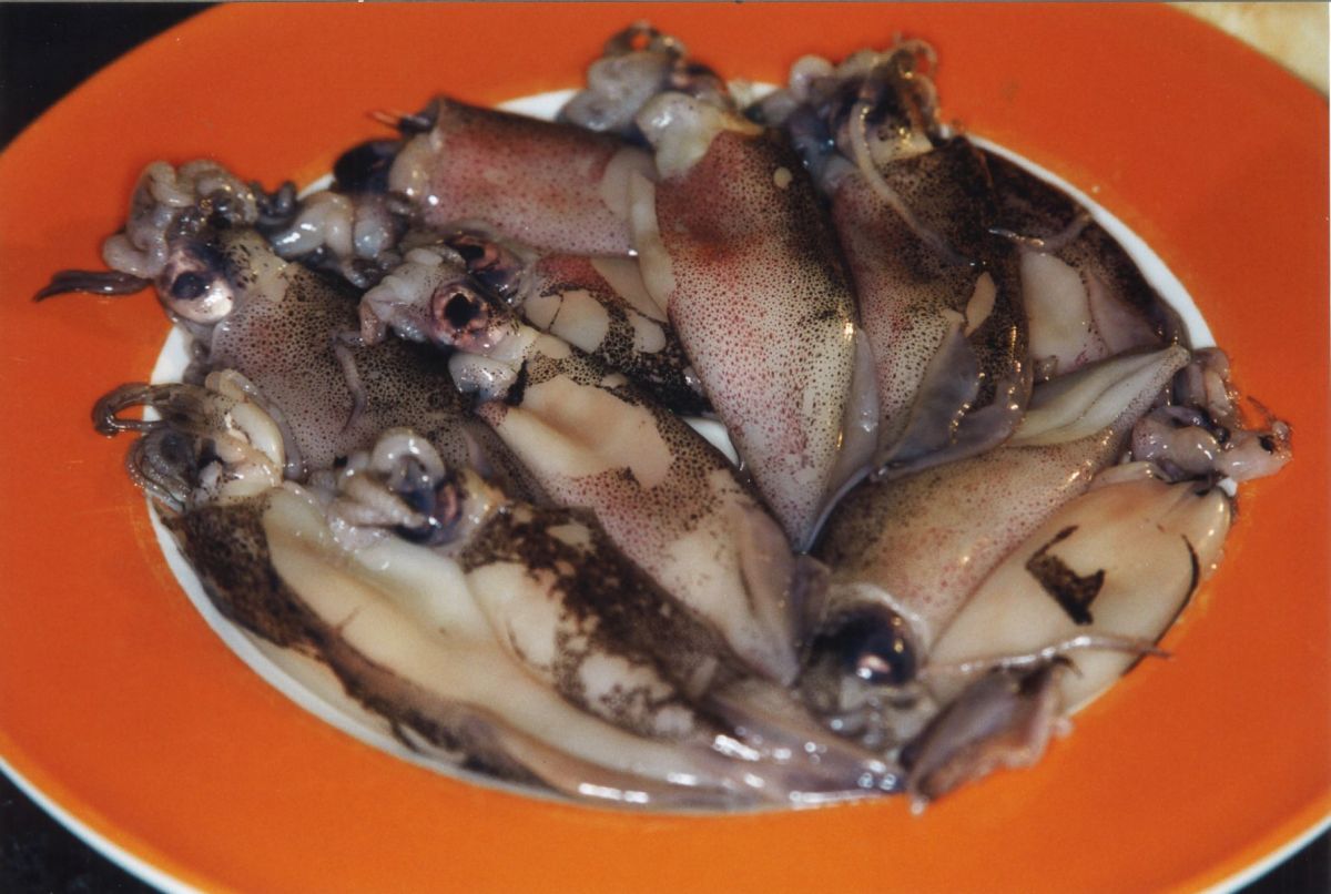 Die reinlichen Frauen putzten und wuschen die kleinen Tintenfische (500g) – häuten, Tuben wenden, Innereien entfernen und dicht am Kopf, die Tentakeln abschneiden, den inneren Kranz mit dem Maul entfernen und in 20 Minuten gar kochen. Wegen der Armut benutzten sie hierfür salziges Wasser, das es im nahen Meer im Überfluss gab. Anschließend schnitten sie die Tintenfische in kleine Würfel.