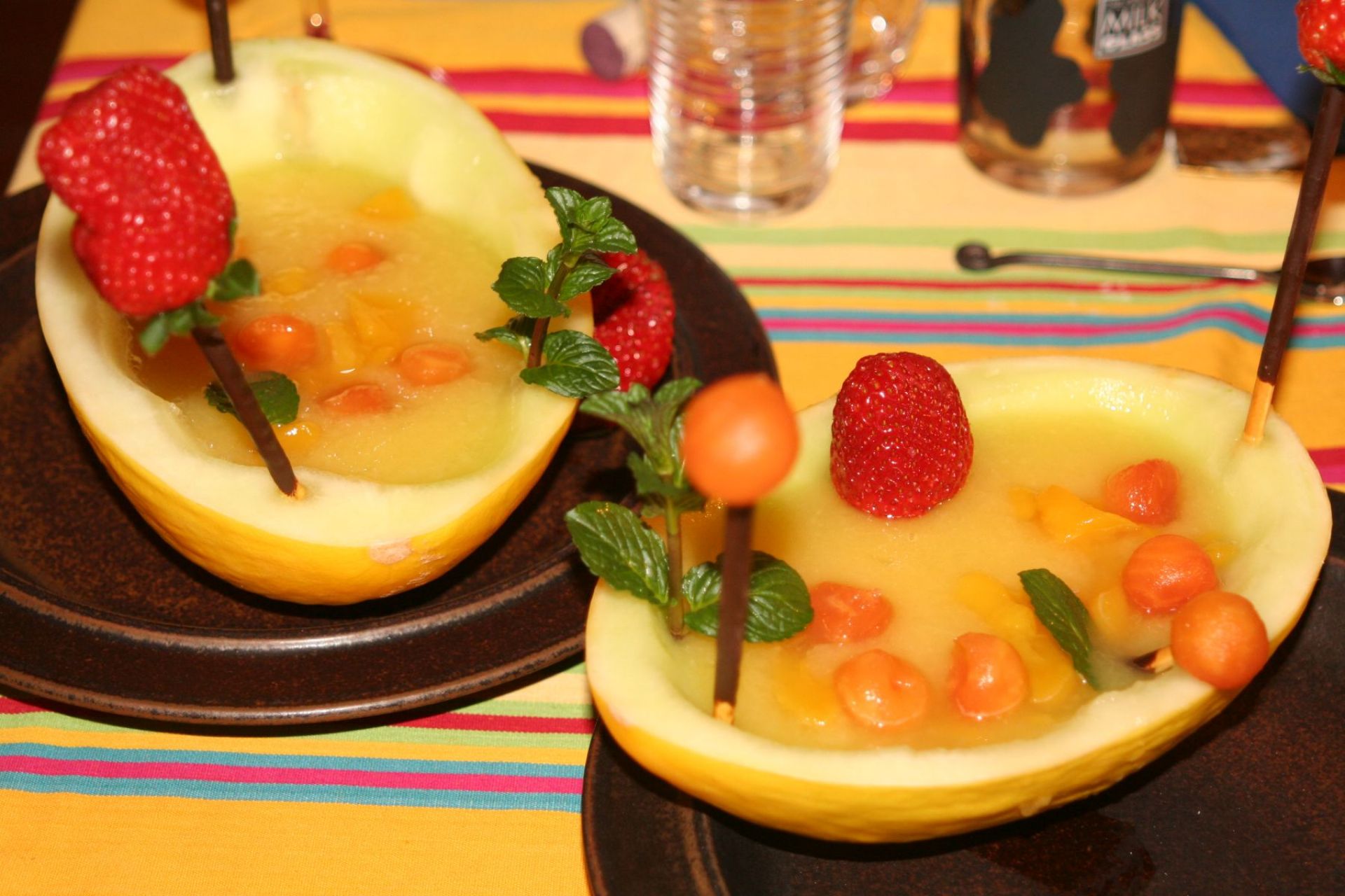 Eine ½ Honigmelone pro Person wird benötigt, im Laden beklopft um am Klang die Frische zu ermitteln, zu Hause halbiert und mit einem Löffel kernfrei ausgeschabt. Nun noch etwas mehr Fruchtfleisch ausheben und mit Himbeeren oder Erdbeeren (080), kugelig ausgestochenen Mango? Pfirsichstückchen? Mirabellen? (Chrissi+Dorothee), mit etwas Zitronensaft und Zucker, Kirschwasser oder Orangensaft (080), Cointreau (Chrissi+Dorothee) mischen und vorsichtig wieder einfüllen. Die halben Früchte nun kalt stellen (auf Eis) und vor dem Servieren den Rand mit Schlagrahm garnieren (080) - ohne Schlagsahne, dafür aus der Tiefkühltruhe, mit Minzblättchen aus dem Garten und gespießten Früchten auf Schokostangen (Chrissi+Dorothee) - Hagelzucker dazu hat sich gut gemacht - und zu zweit drin löffeln wäre auch angemessen (Hans).