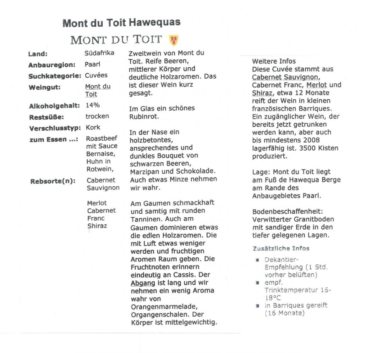 Stephan empfiehlt diesmal seinen 2003er Hawequas, einen gelungenen Rotwein vom Gut Mont du Toit, der sich harmonisch zum Lamm entwickelt.
