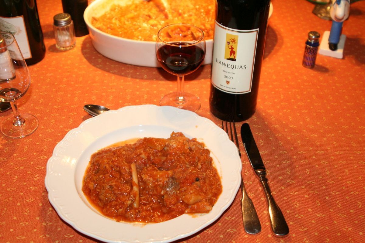 Zum Essen stellt man Ablageteller für die vom Fleisch fallenden Knochen bereit, die auch die vielen Gewürzschalen und Gehäuse aufnehmen. Dass es heute noch üblich ist, die abgenagten Knochen einfach hinter sich zu werfen, hat Stephan weit von sich gewiesen und solches, diesem Essen angemessene Verhalten, würde sich ohnehin nur anbieten, wenn man draußen in der Savanne an einem offenen Lagerfeuer während einer Safari einheimisch bekocht wird. Hier also große Servietten decken und einen kräftigen roten Wein ausschenken.