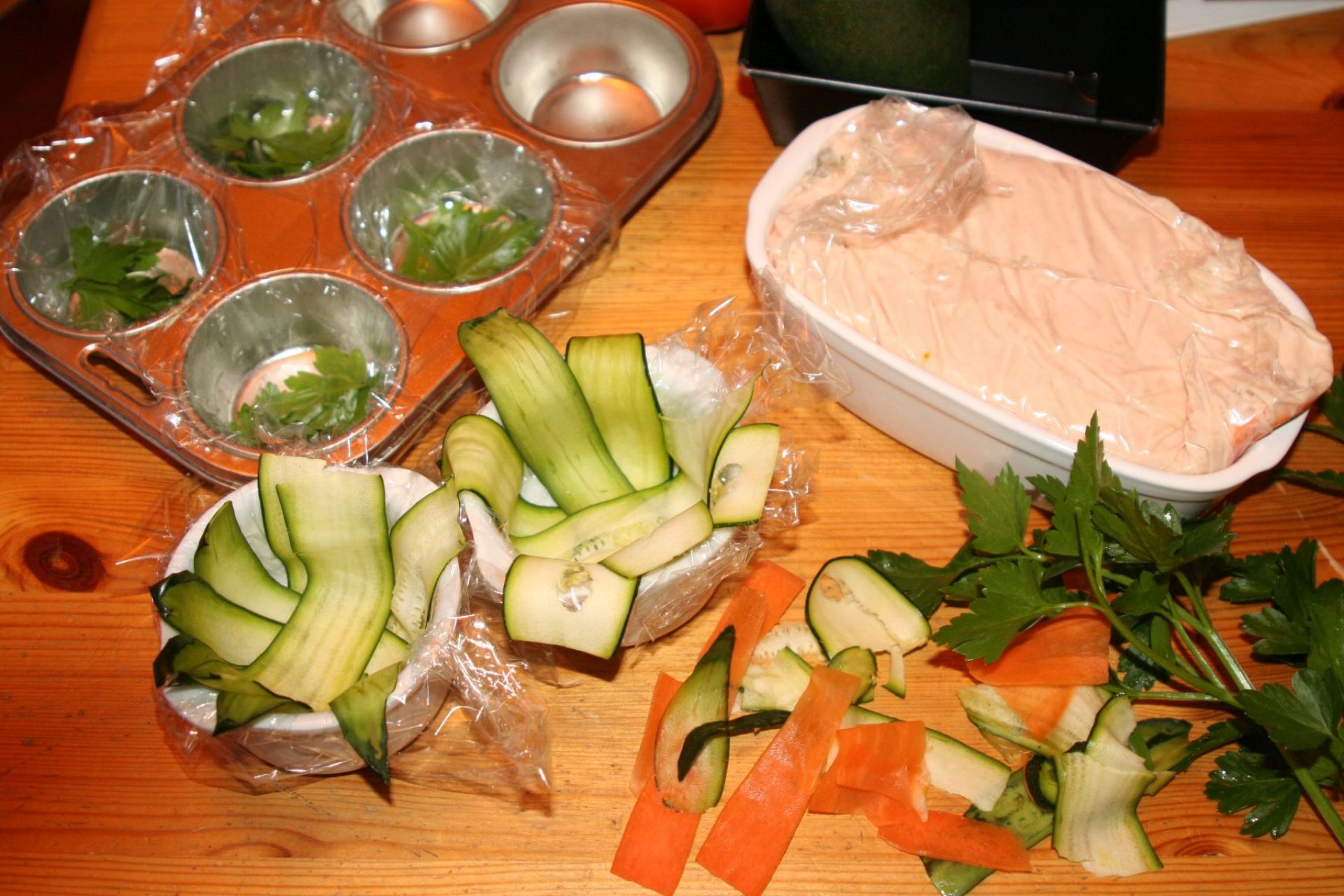 Die vorhandenen Pastetenförmchen mit Frischhaltefolie auskleiden und mit hauchdünnen Längsstreifen der Zucchini oder Karotte auslegen. Glatte Petersilie geht auch und alles was Eure Phantasie hergibt.