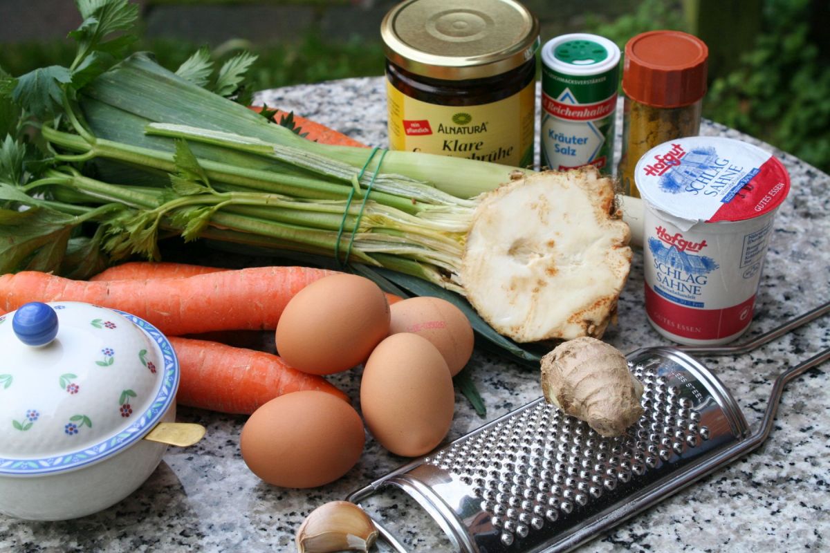 4 Karotten und 2 Suppengrün werden benötigt, dazu frischer Ingwer geraspelt und Gemüsebrühe, Curry und Kräutersalz, „Suppe benötigt immer etwas Zucker“ – und verrät damit ihren Geheimtipp, mit Knoblauch kann man schon variieren. Dazu benötigen wir 4 Eigelb und Sahne oder saure Sahne.