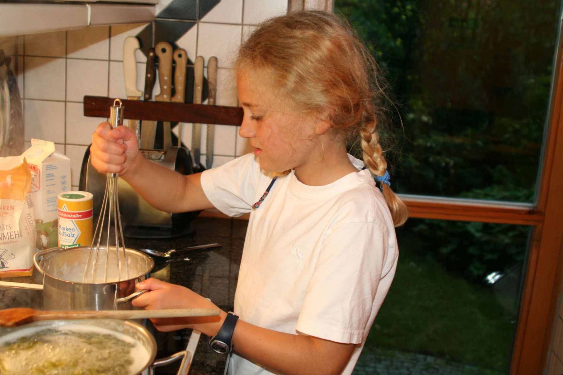 Zuerst legt sie ganz ordentlich alle Zutaten bereit und setzt das Nudelwasser auf. Auch der Tisch kann schon gedeckt werden, denn jetzt geht es schnell. Gotje lässt einen ordentlichen Klacks gute Butter schmelzen und rührt ein bis zwei Esslöffel Mehl hinein. Dafür ist ein Schneebesen gut und wenn jetzt noch Milch dazu kommt, ist das eine Mehlschwitze. Mit der Milch und unter ständigem Rühre entsteht unter Gotjes verständigen Händen eine sämige Grundsoße, in die nun der Frischkäse kommt. Der schmilzt so vor sich hin und muss manchmal umgerührt werden – etwas Salz dazu und fertig – oder doch noch ein bisschen Milch dazu, weil sie zu dick ist? Die Nudeln sind inzwischen fertig und jetzt schnell die Soße darüber, bevor sie zu Beton erstarrt.