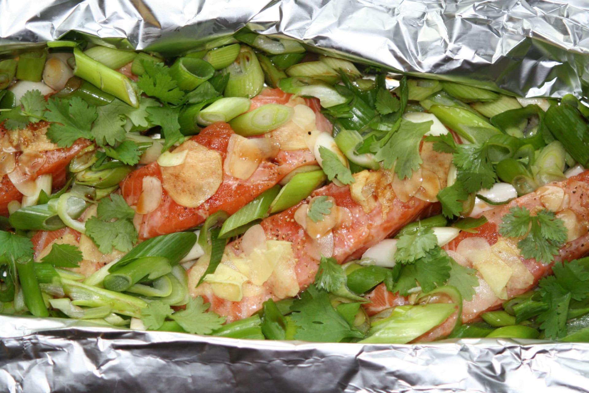 Der frische Lachs wird in Schnitten geteilt und auf einer großen Alufolie angerichtet. Mit Zitrone, Pfeffer, Salz und Sojasoße wird er mariniert, mit wenigen dünnen Knoblauchscheiben garniert, dazu kommt frischer Ingwer, der statt geraspelt zu werden, mit einem scharfen Küchenreiberaspelschneider in hauchdünne Scheiben geschnitten wird. Zum Ingwer kommt noch reichlich frischer Koriander (beim Türken, wenn nicht famila) und ein ganzes Bund Lauchzwiebeln. Hier ist es wichtig, den richtigen Schnitt anzusetzen: Schräg schneiden, wie die penne lisce, aber nicht so lang wie diese. Auf, über und neben dem Lachs garnieren und die Folie verschließen. Das Päckchen wird nun frei von irgendwelchen Fettzutaten auf einem Drahtrost über einem Wasserbad gegart - mehr gedämpft. Dazu eignen sich alle Kochtöpfe, wenn man einen passenden Einsatz findet oder bastelt. Die Garzeit ist kurz, 10 Minuten reichen dicke. Es passen auch große Bräter auf kleine Platten, denn es muss ja nur ein wenig Wasser zum Kochen gebracht werden. Kinki hat den Backofen vorgezogen – dauert aber deutlich länger.