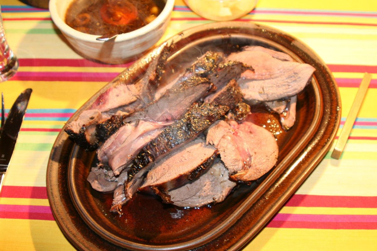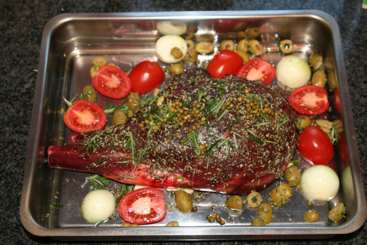 Die frische Rehkeule haben wir mit Salz abgerieben, etwas italienische Kräutermischung aufgebracht und dann mit frischem Rosmarin und grünem Pfeffer bedeckt. Um die Keule herum machen sich dann halbierte Tomaten, Zwiebeln und Oliven gut. Einfach rein in den kurz 200°C heißen Backofen (Heißluft, sonst 225°) und nach 15 Minuten, wenn die Poren geschlossen sind, auf 160° (175°) runterschalten. Gern etwas Rotwein oder Brühe angießen, damit die schönen Zutaten nicht verbrennen und eine Grundlage für die Soße entsteht. 1½ Stunden Bratzeit muss man wohl rechnen – je nach Größe, Herd und durch.