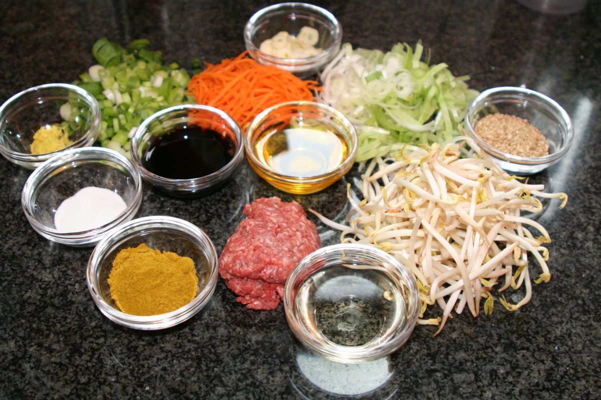 Hackfleisch anbraten (Sesamöl?) und würzen mit Curry, ablöschen mit etwas Reiswein und Sojasoße, Lauchzwiebeln, dünne Lauchringe, Sojasprossen dazu, etwas Ingwer und Glutamat – zufrieden?