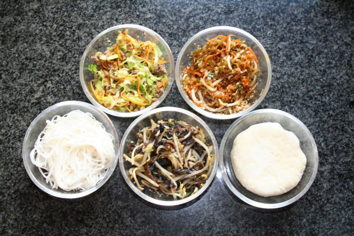 Jetzt die Glasnudeln vorbereiten (nicht so viel) und mit den Füllungen vermengen, das gibt etwas Volumen und neutralisiert zu stark gewürzte Mischungen. Es gehen auch die restlichen Sojasprossen.